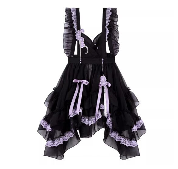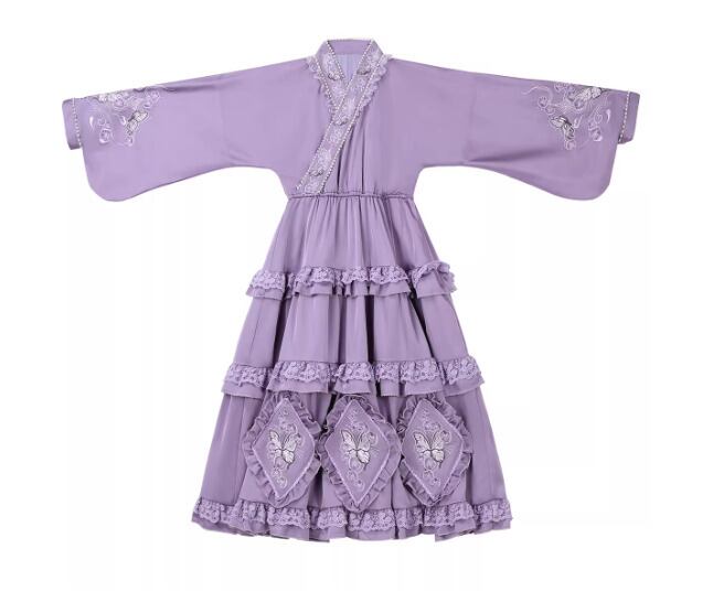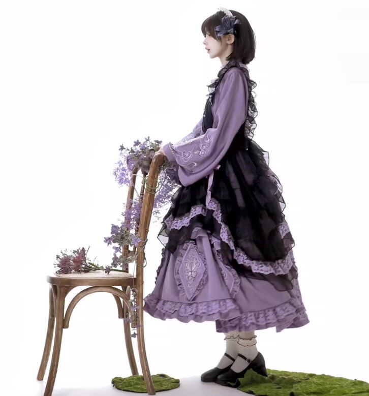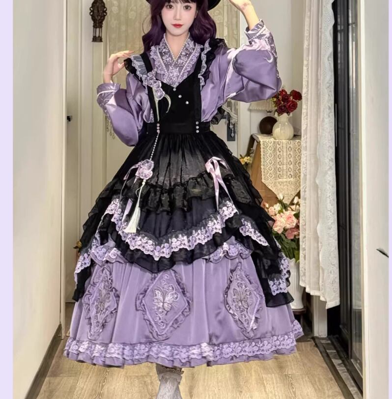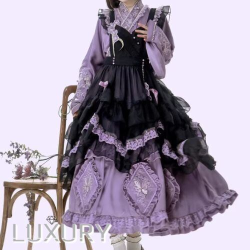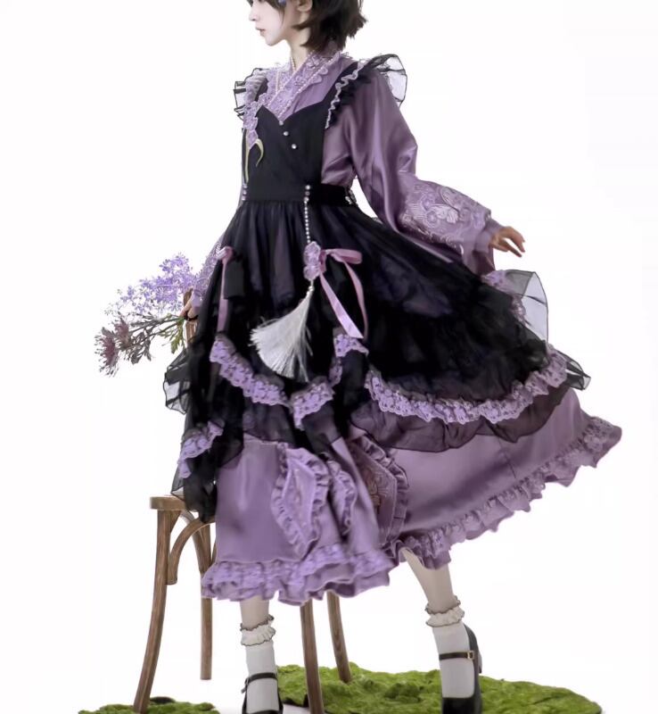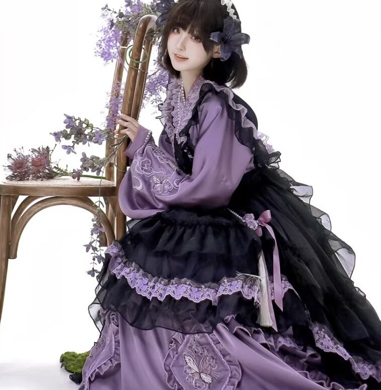 華ロリ 中華ロリ ワンピース + エプロン のみ 胡蝶蘭 デザイン ロング丈 シフォン サテン 中国風 クラシカル 優雅 エレガント レディース お茶会 撮影会