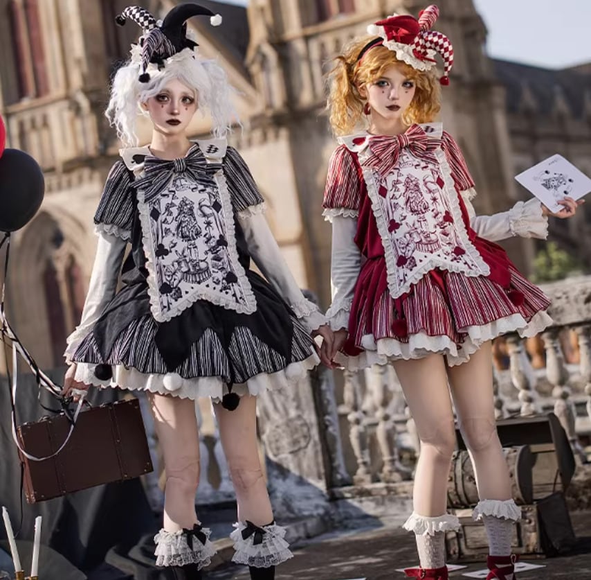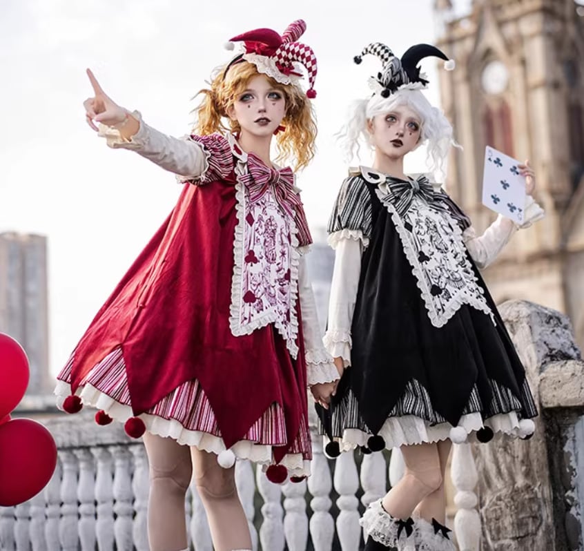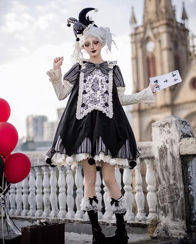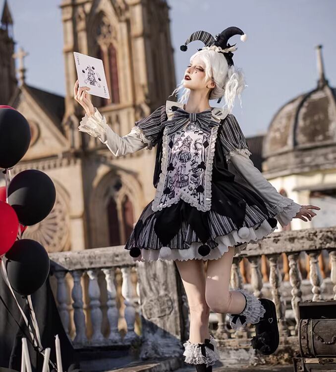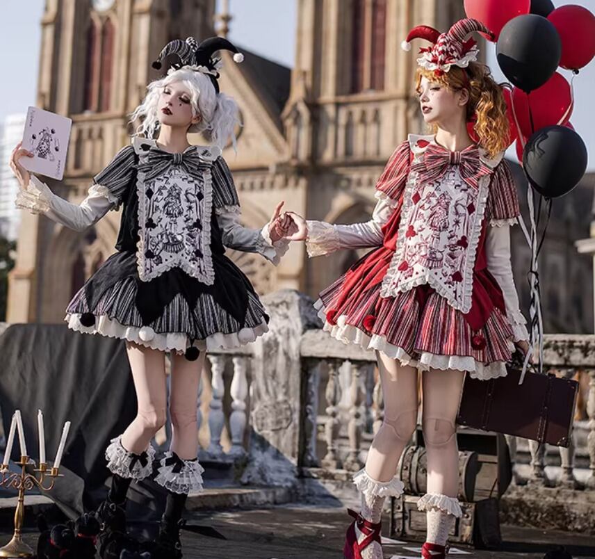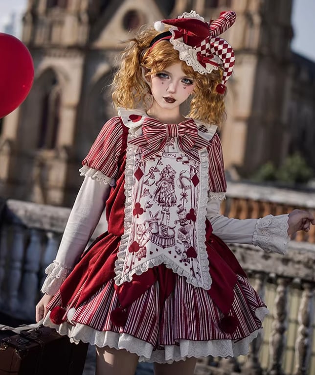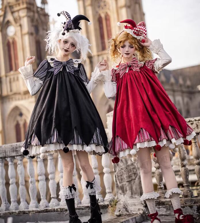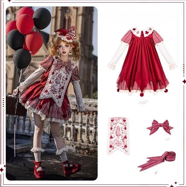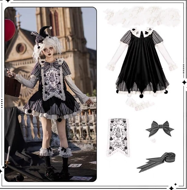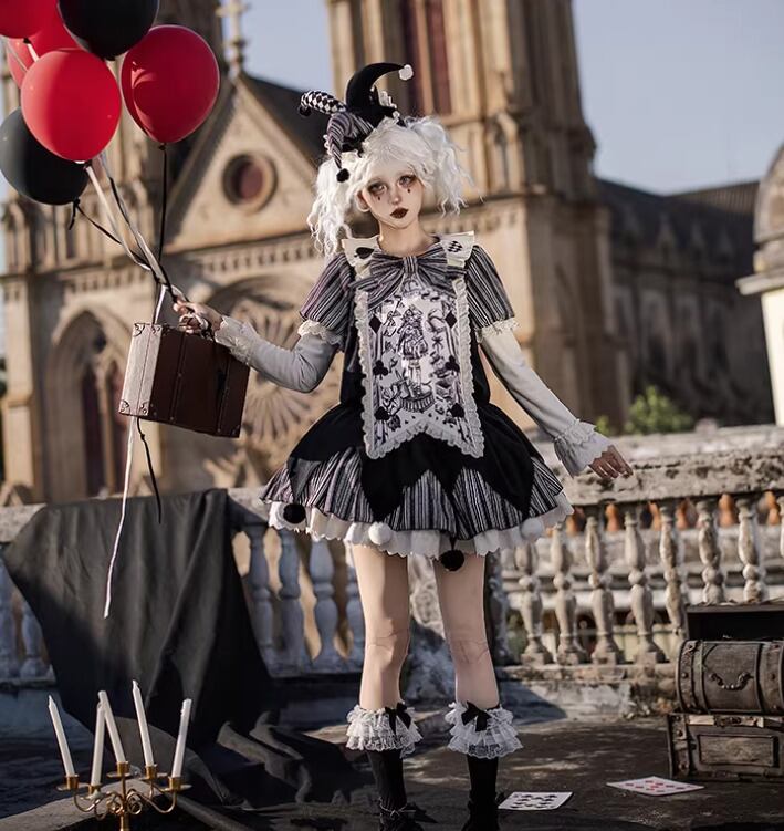 ロリータファッション ワンピース + 胸当てパーツ + リボン + ベルト 4点セット ピエロ風 サックドレス ゆったり ミニ丈 膝上 華やか レディース イベント