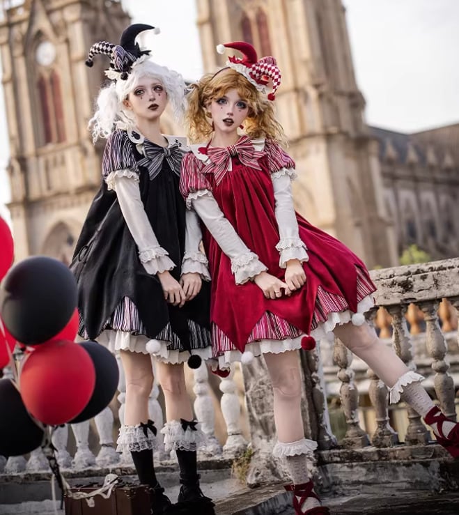胸当てパーツ、リボン、ベルトが揃い、ピエロ風のサックドレスは