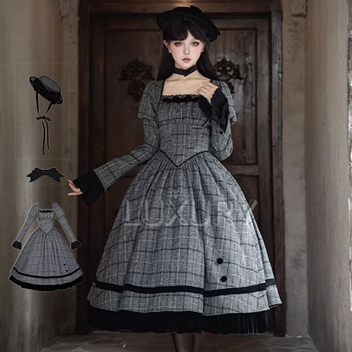 クラシカルロリータ クラロリ ワンピース + リボン + ミニハット 3点セット コルセット風 チェック柄 ひざ下丈 ミモレ丈 英国スタイル 英国風 エレガント 秋冬コーデ お茶会