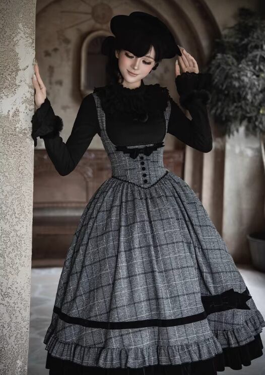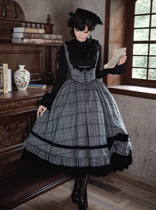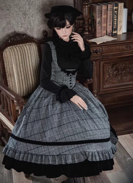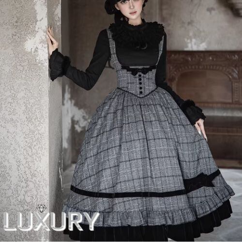 クラシカルロリータ クラロリ ジャンパースカート + リボン 2点セット コルセット風 チェック柄 バッスル 英国スタイル 英国風 エレガント 秋冬コーデ お茶会