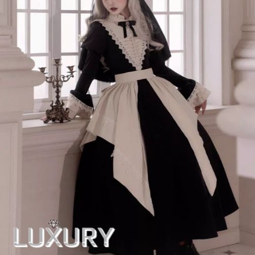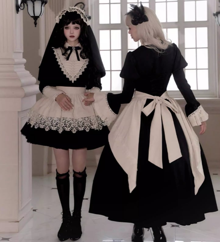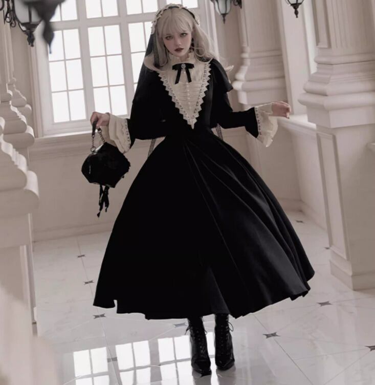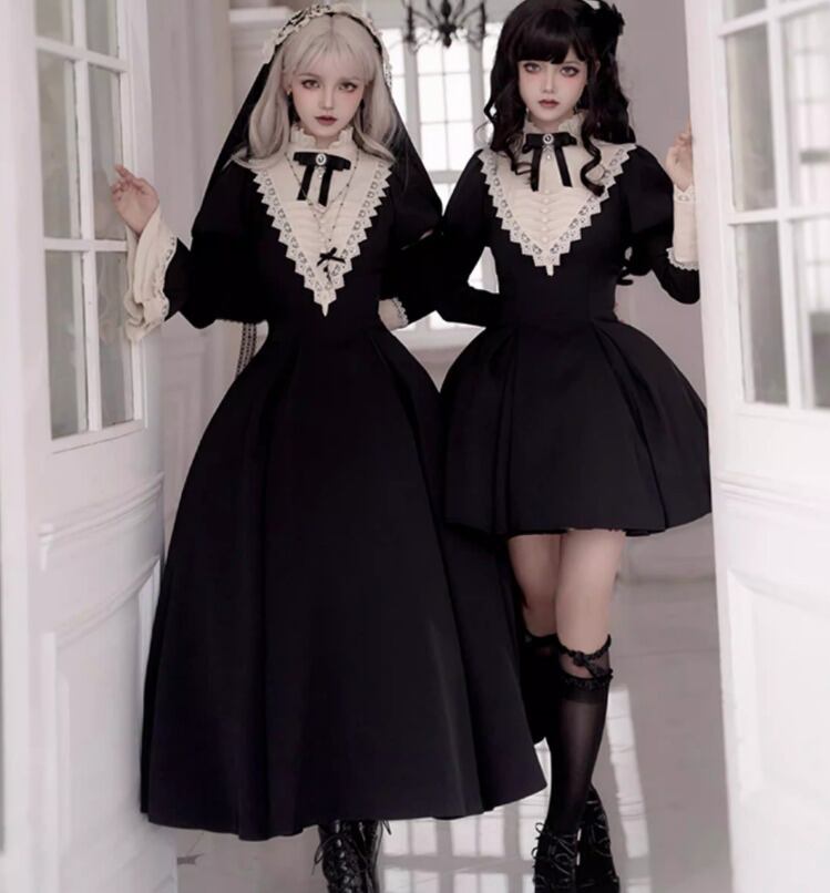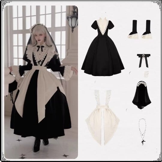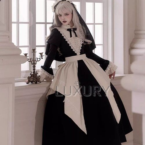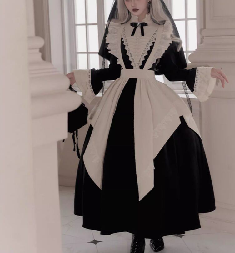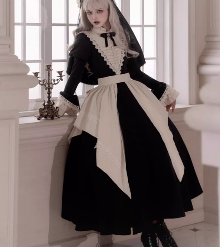 ゴスロリファッション ゴスロリ ワンピース + 付け袖 + エプロン + ヘッドドレス + リボンブローチ + ネックレス 6点セット ロング丈 修道女 きちんと感 撮影会