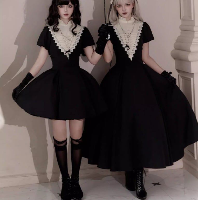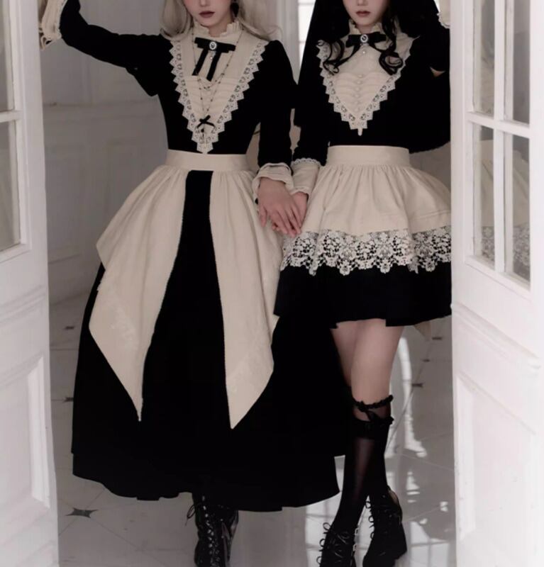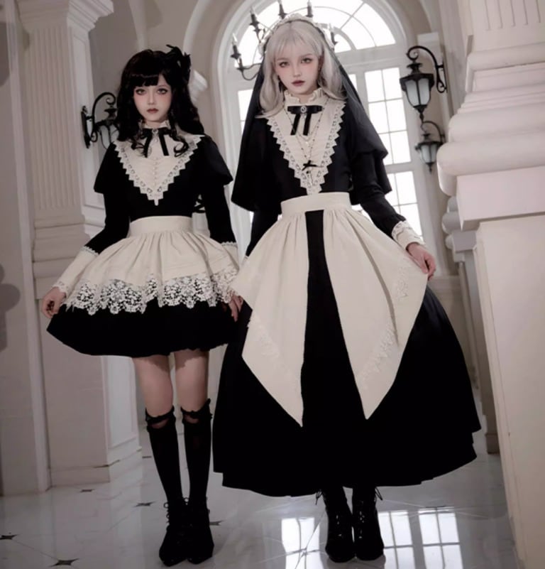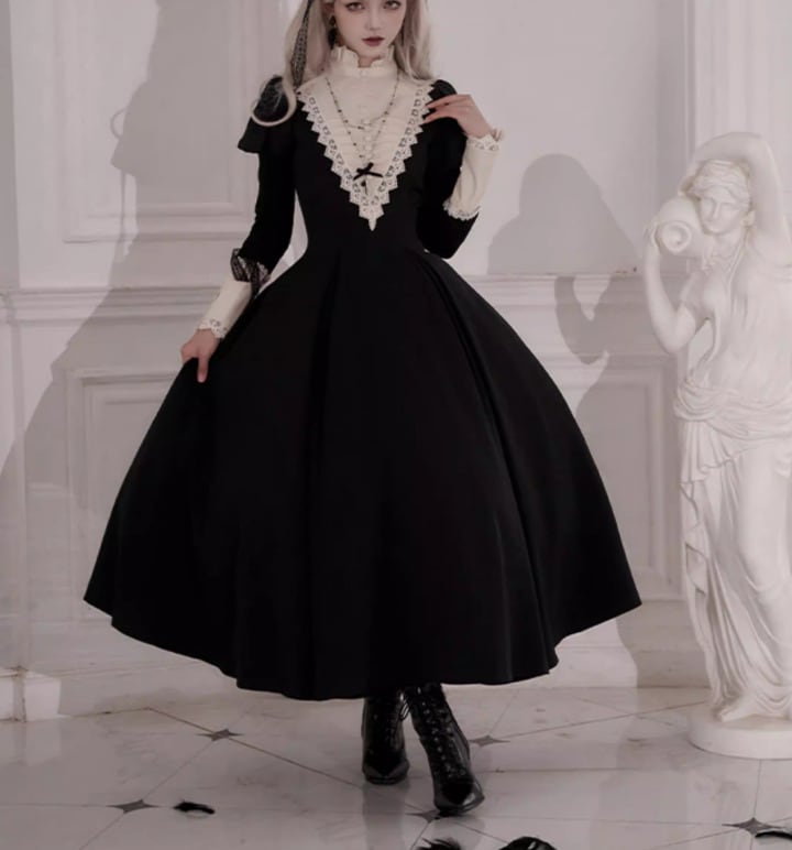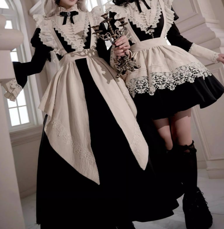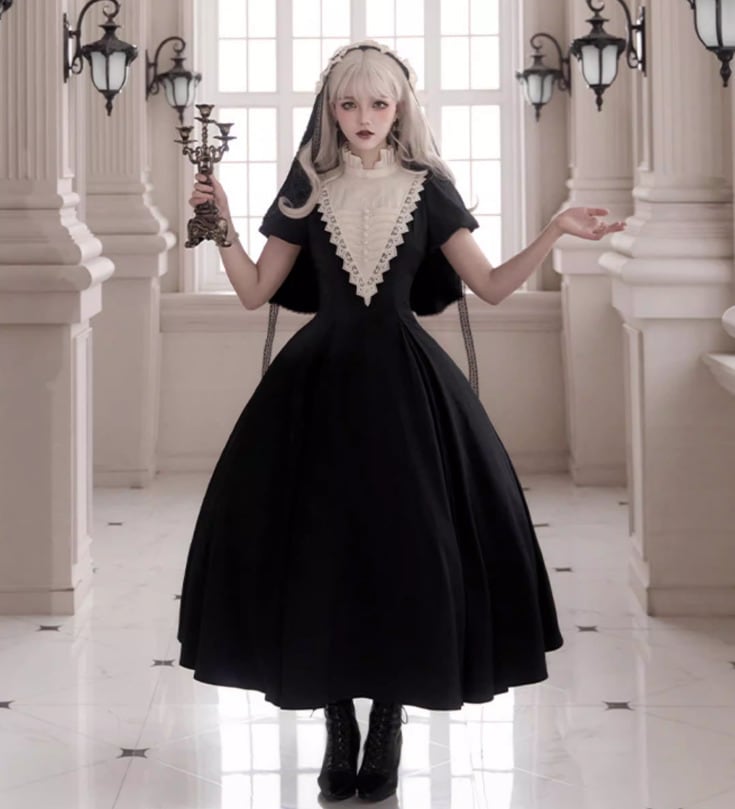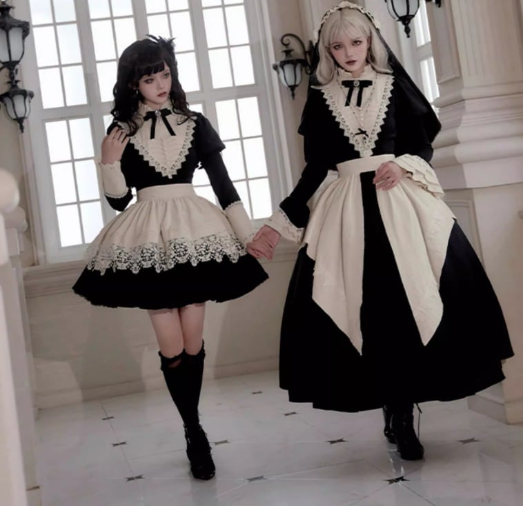 ゴスロリファッション ゴスロリ ワンピース + 付け袖 + エプロン + ヘッドドレス + リボンブローチ + ネックレス 6点セット ロング丈 修道女 きちんと感 撮影会