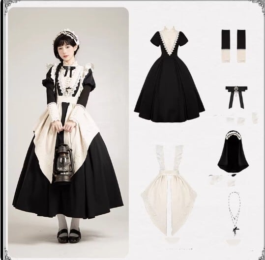 こちらは【ワンピース + 付け袖 + エプロン + ヘッドドレス + リボンブローチ + ネックレス 6点セット】の販売となりますが、他のアイテムは付属しておりませんのでご注意ください。