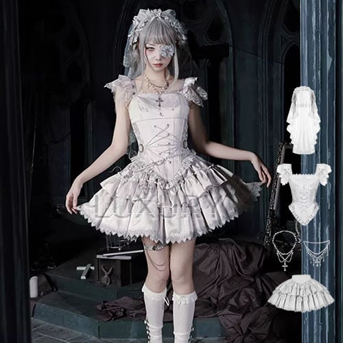 ゴスロリファッション ゴスロリ ショートスカート + コルセット風ビスチェ + ベール付きヘッドドレス + ウエストチェーン + ネックレス 5点セット エレガント 撮影