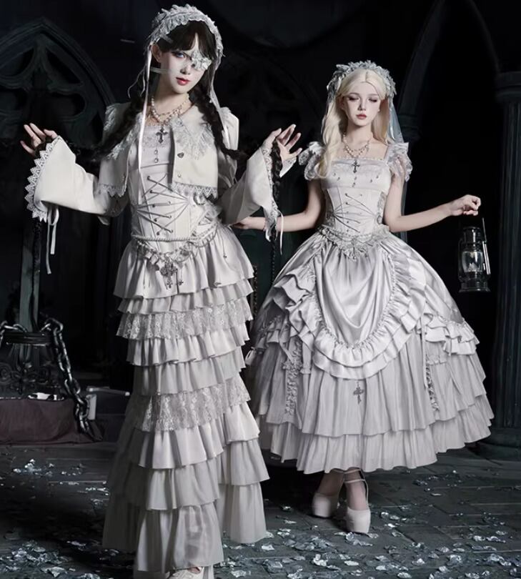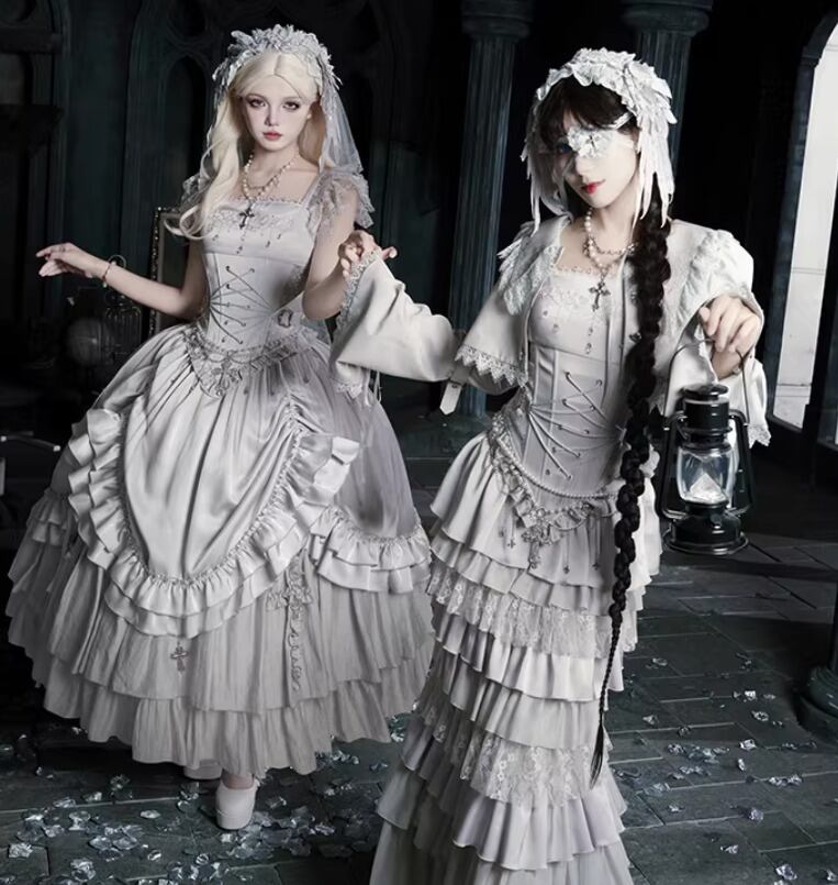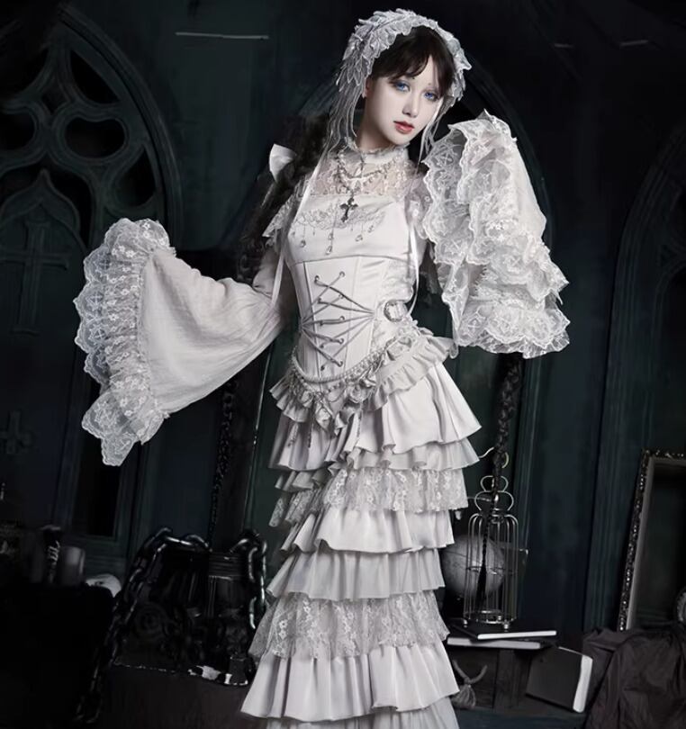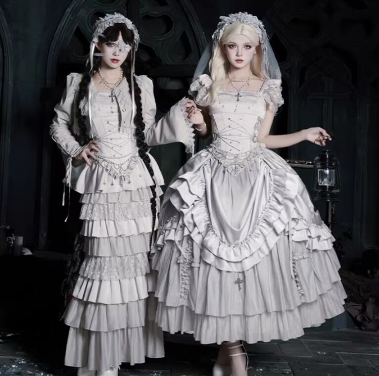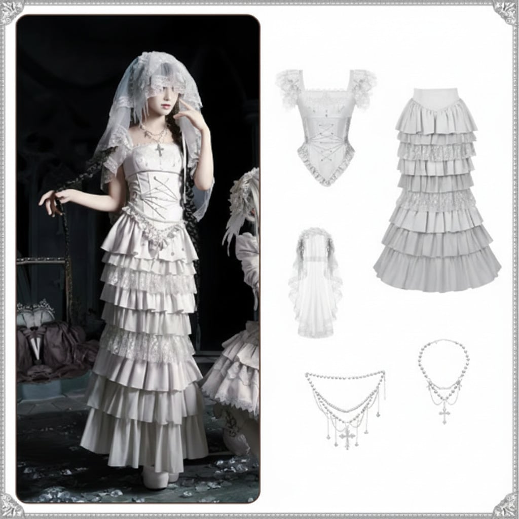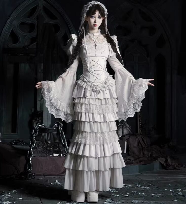 ゴスロリファッション ゴスロリ マーメイドスカート + コルセット風ビスチェ + ベール付きヘッドドレス + ウエストチェーン + ネックレス 5点セット エレガント 撮影
