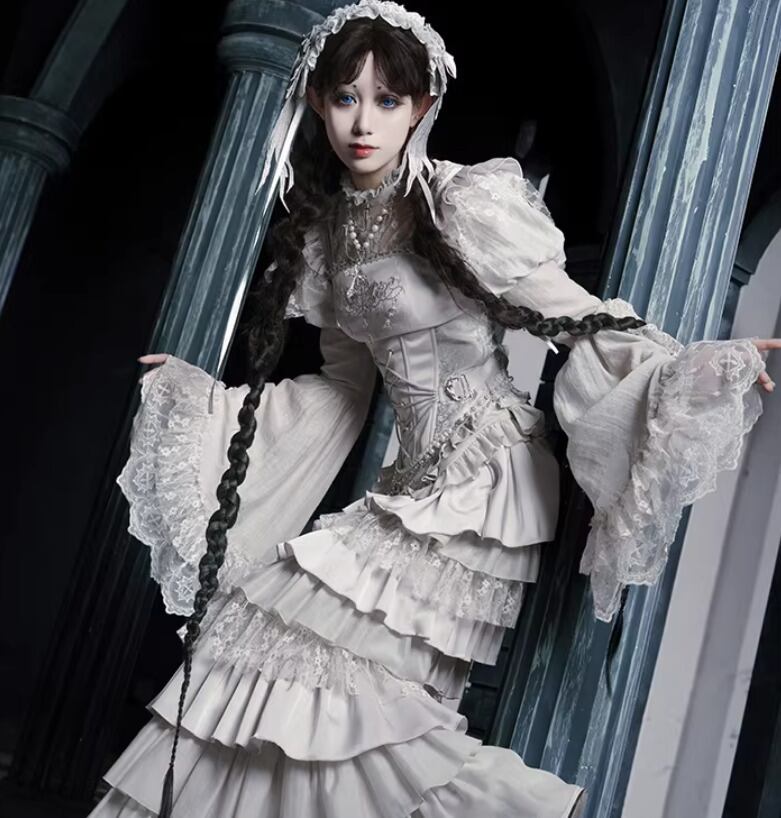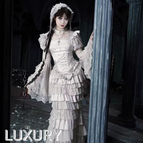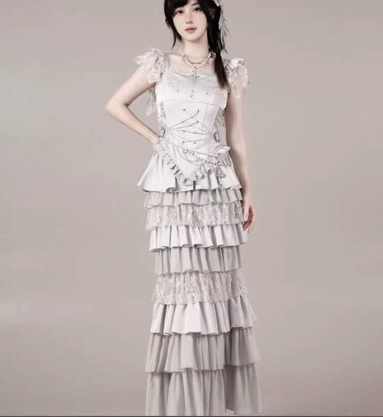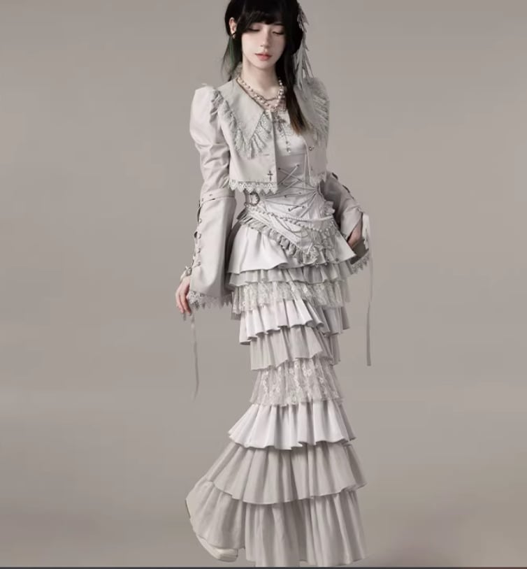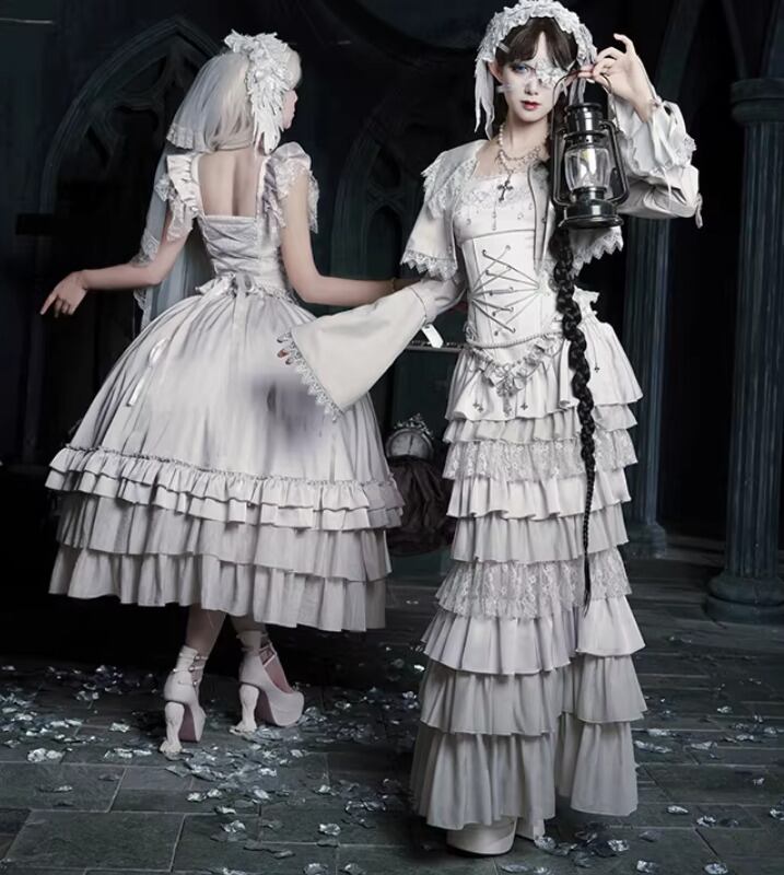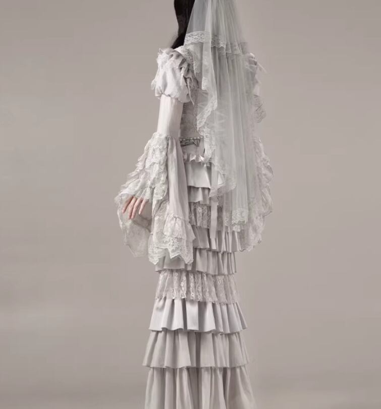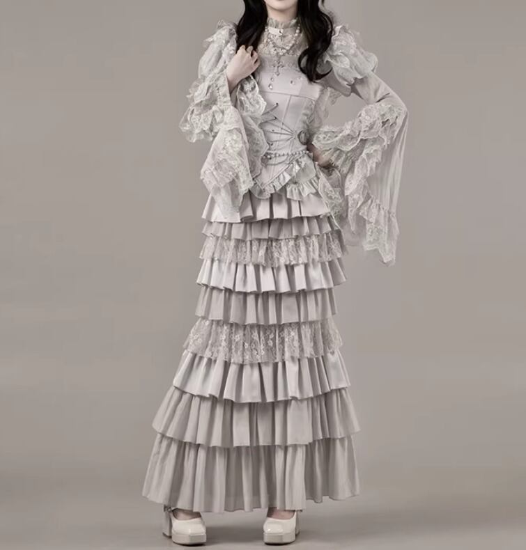 ゴスロリファッション ゴスロリ マーメイドスカート + コルセット風ビスチェ + ベール付きヘッドドレス + ウエストチェーン + ネックレス 5点セット エレガント 撮影