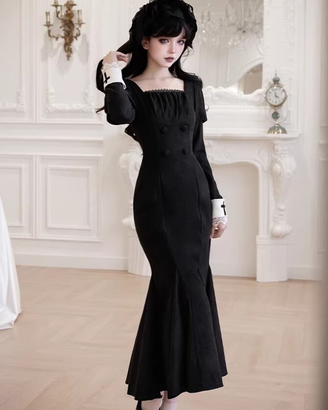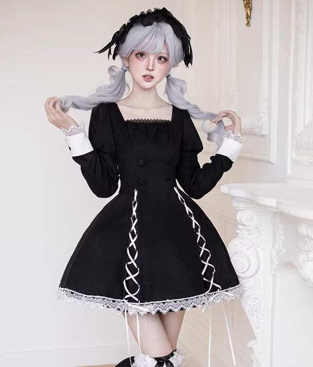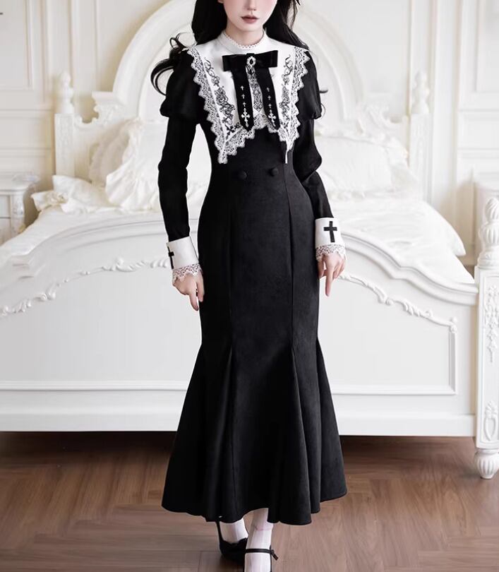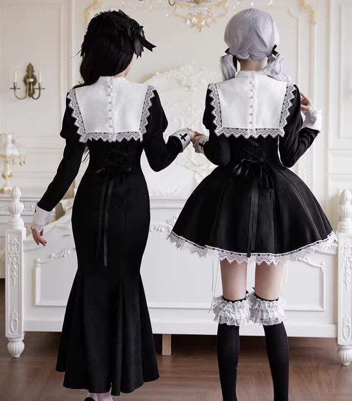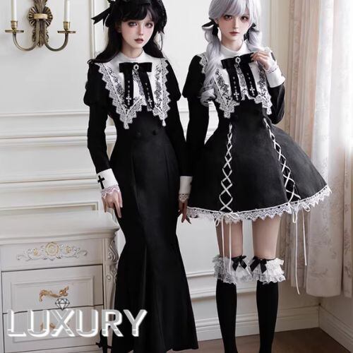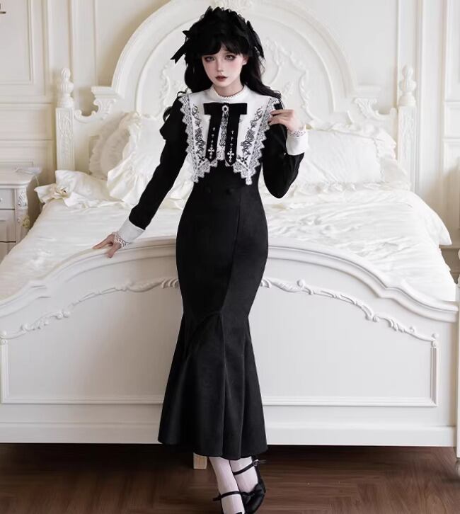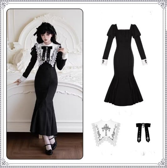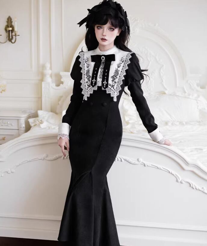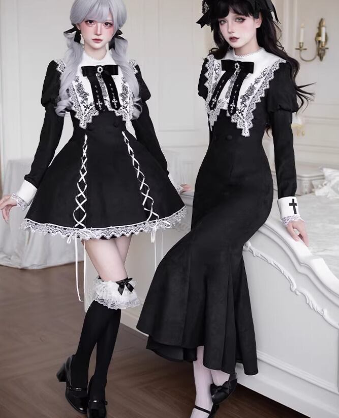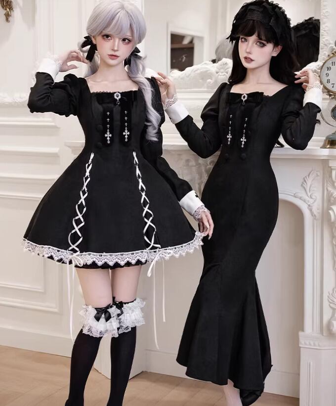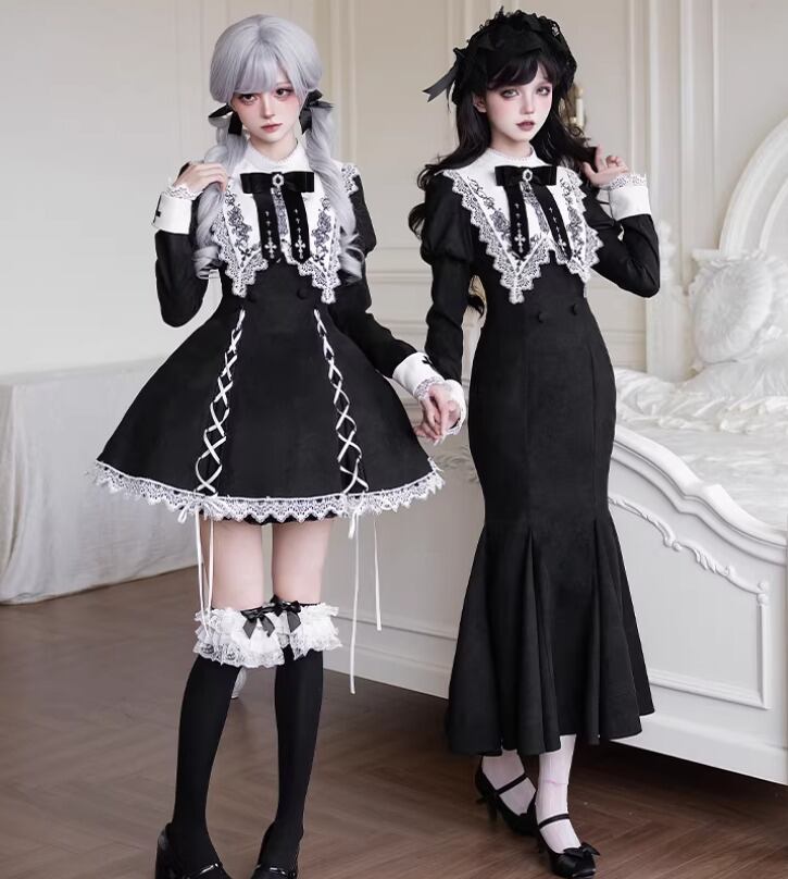 ゴスロリファッション ゴスロリ ワンピース + 付け襟 + リボンブローチ 3点セット マーメイドタイプ ミニ丈 お嬢様 フェミニン エレガント 冬コーデ お茶会 イベント