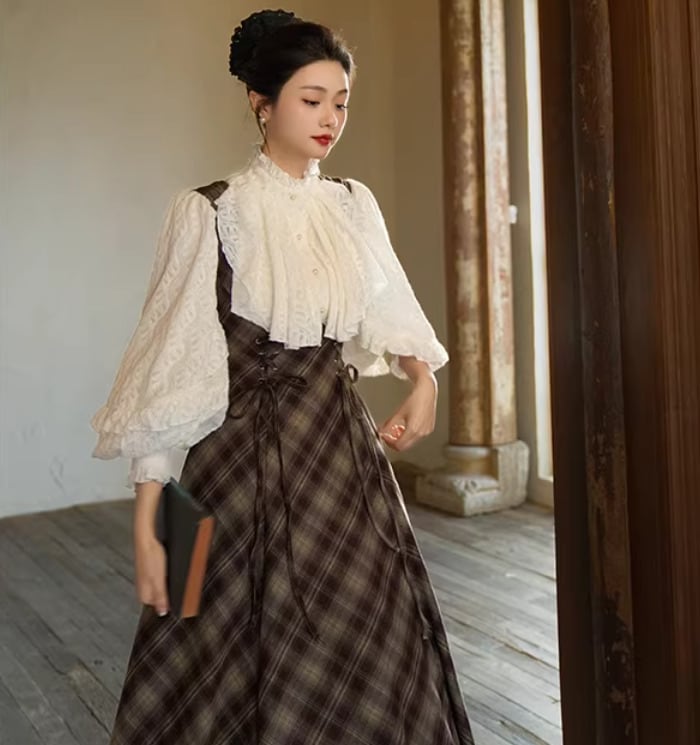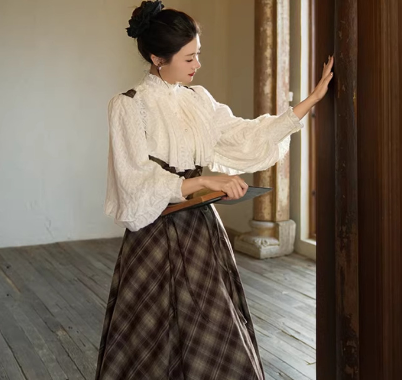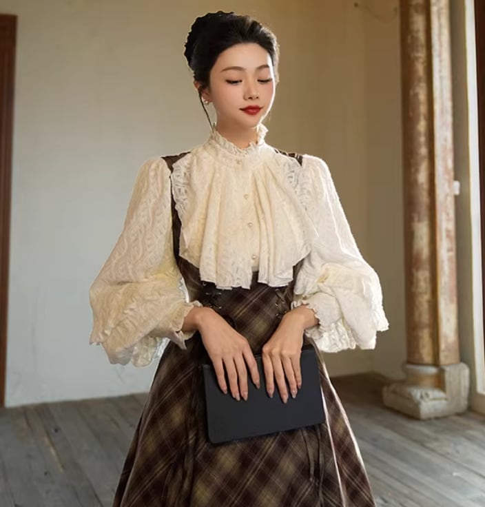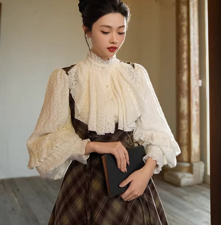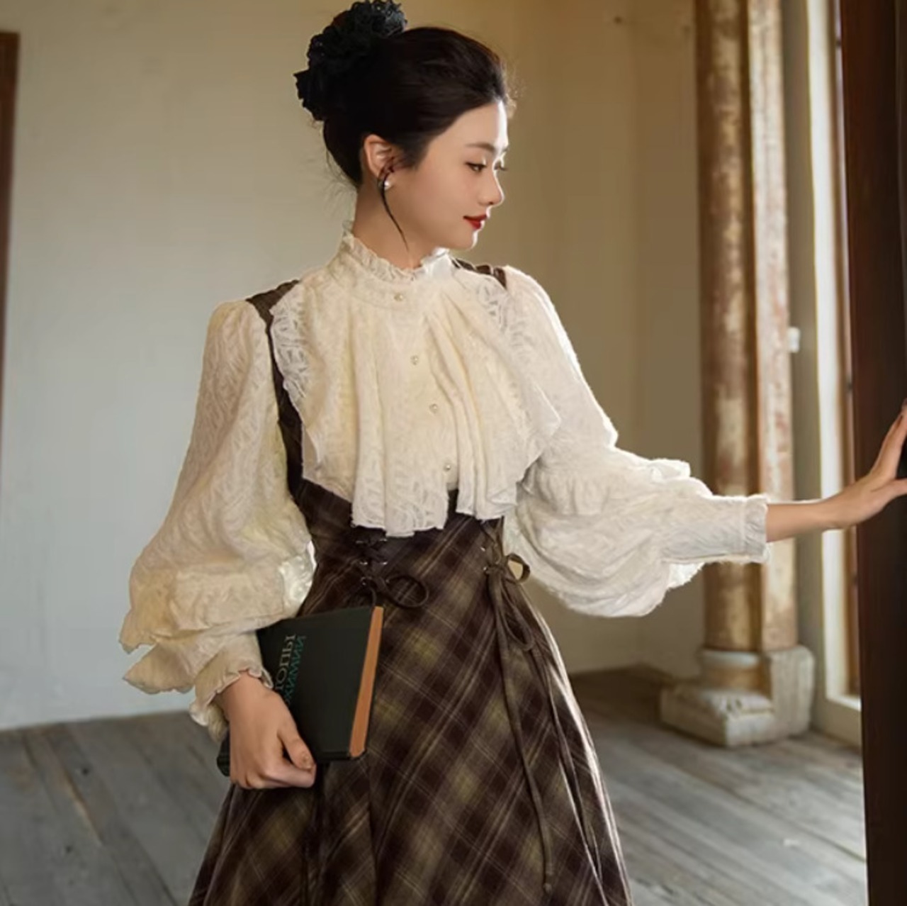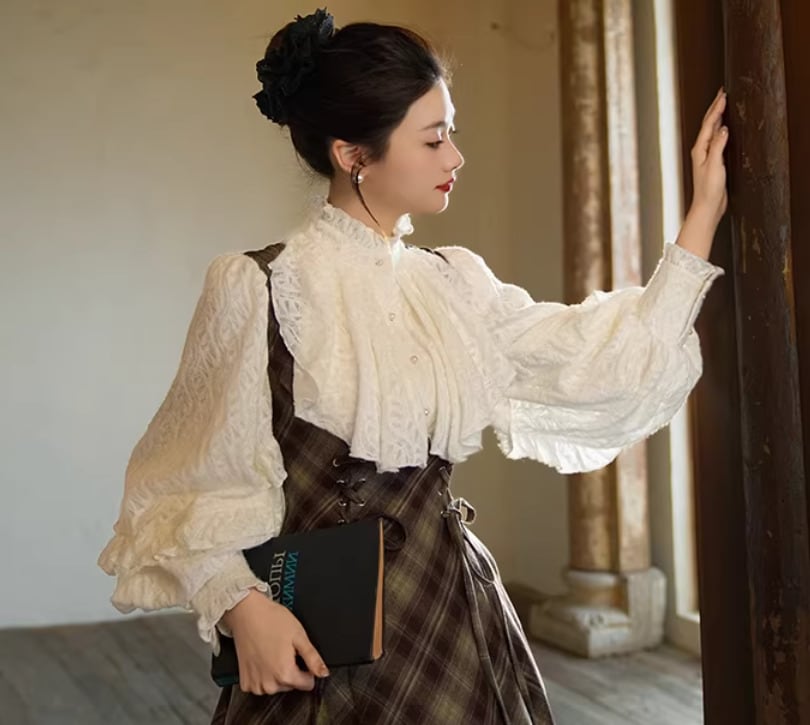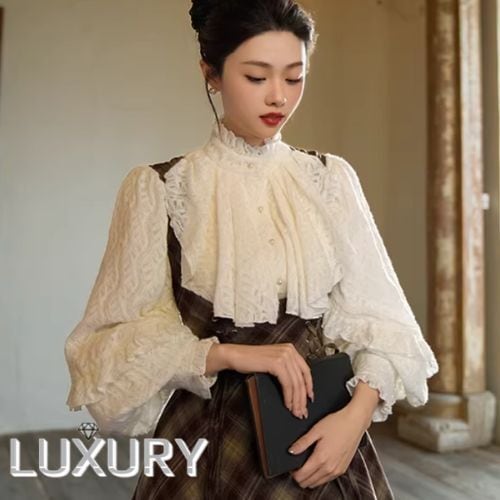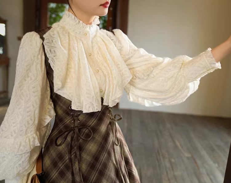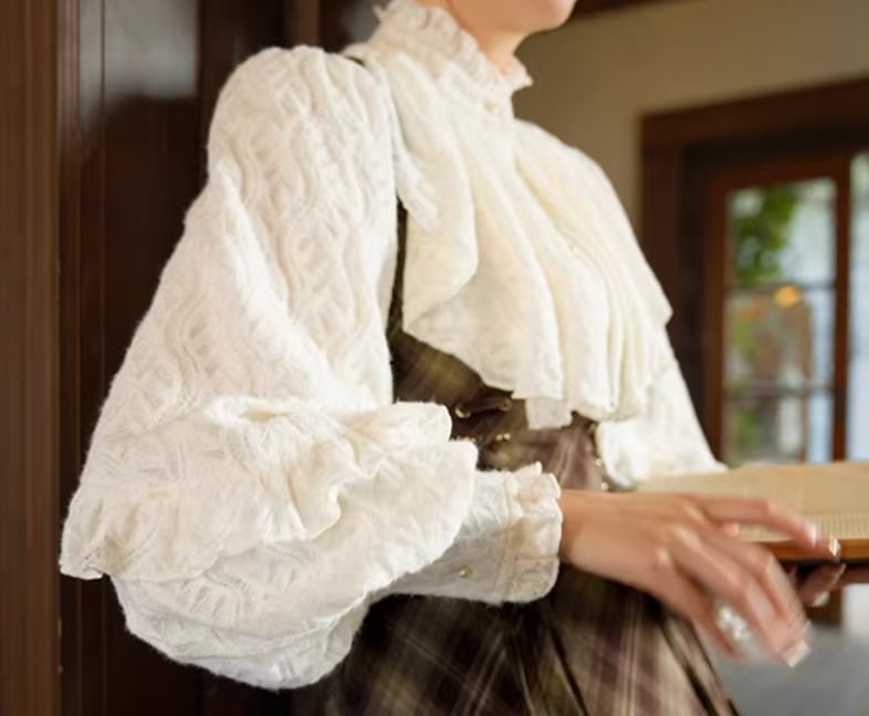 【納期1ヶ月】セミロリータ ブラウスのみ レース 長袖 パフスリーブ 立ち襟 フレンチクラシカル 宮廷風 貴婦人 ナチュラル 上品 清楚 春秋コーデ お茶会 デート