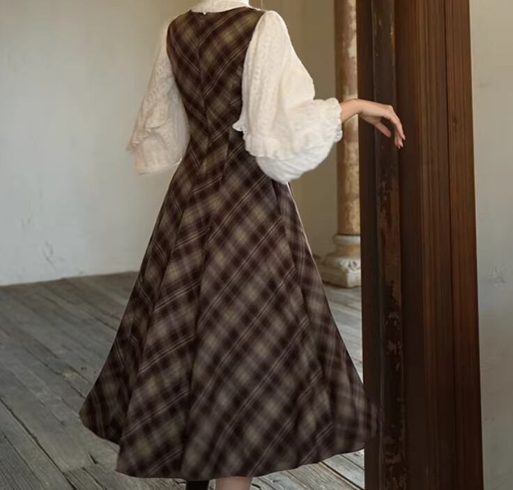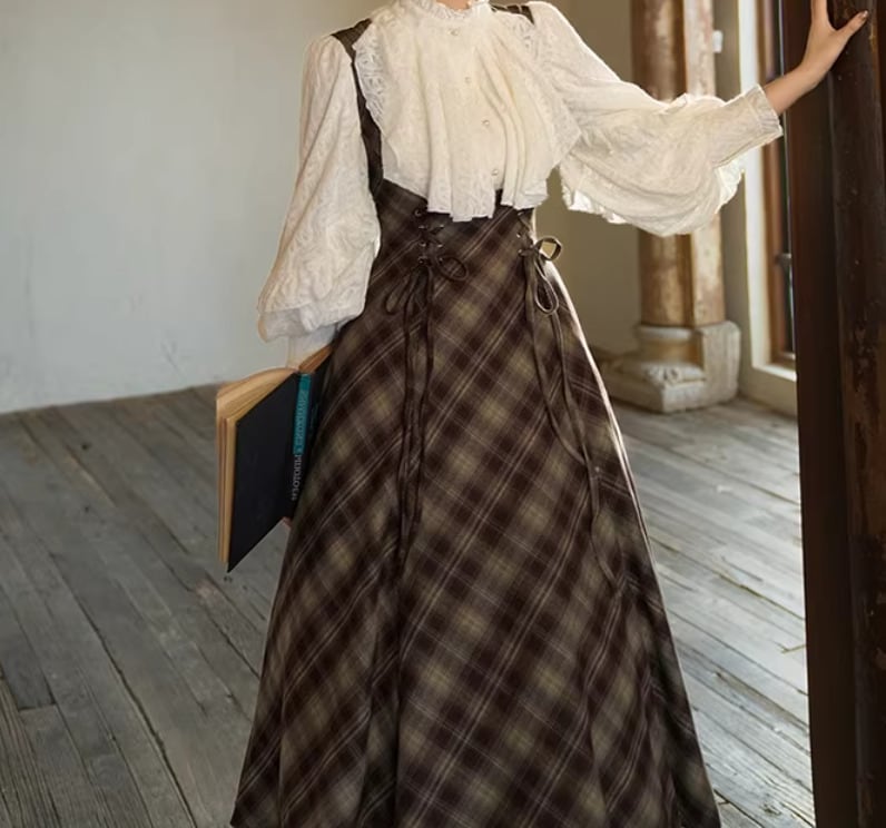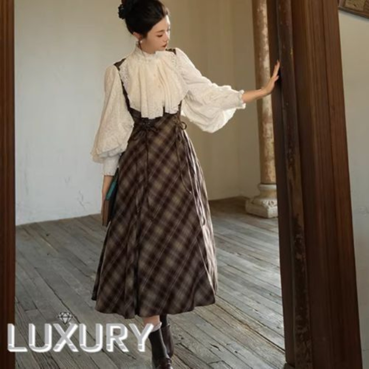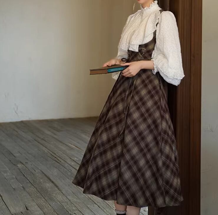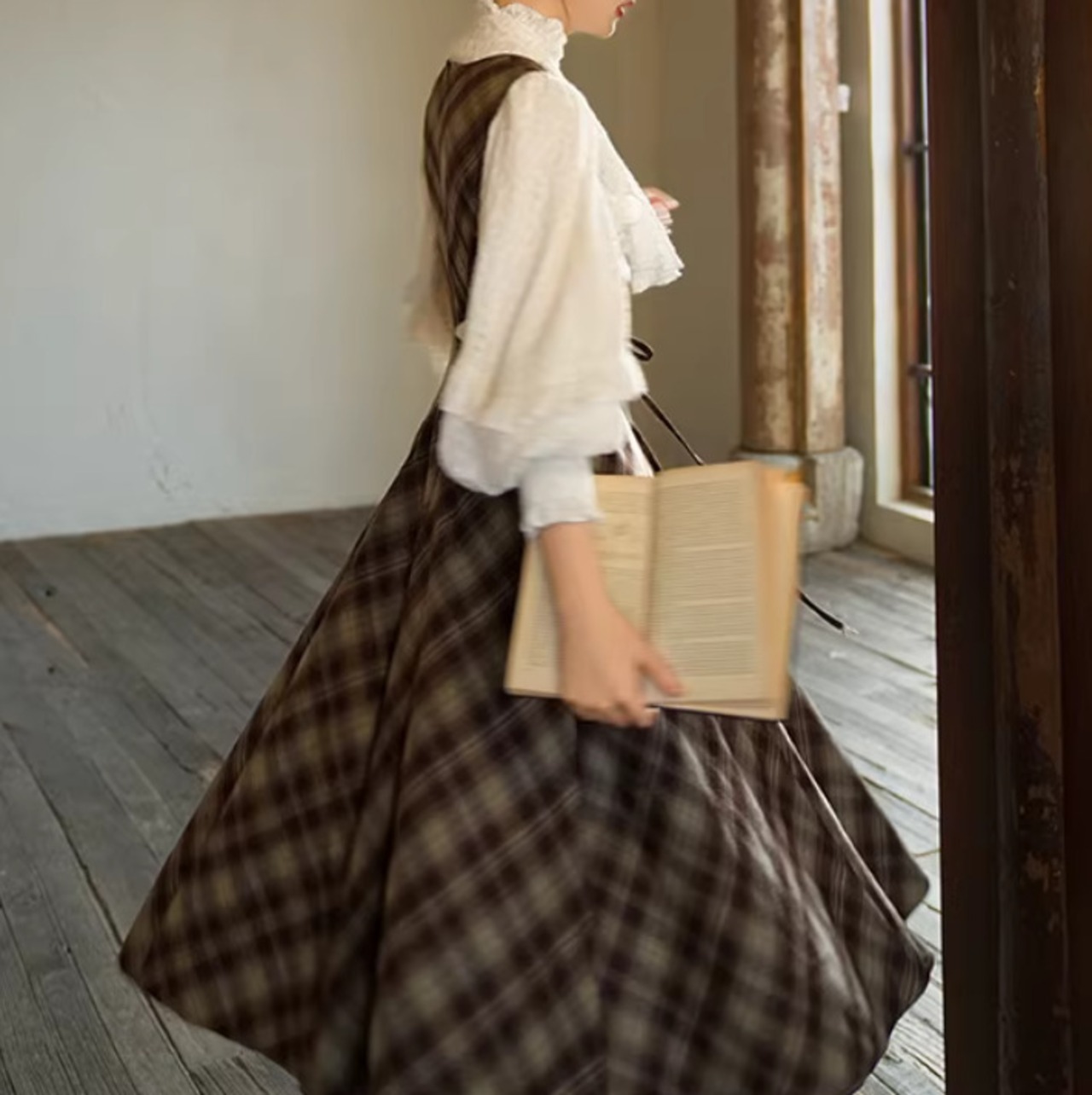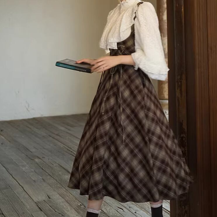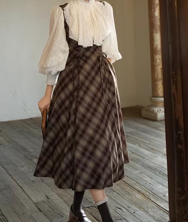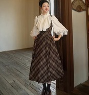 【納期1ヶ月】セミロリータ ジャンパースカート のみ チェック柄 ひざ下丈 ミモレ丈 フレンチクラシカル 宮廷風 ナチュラル 上品 清楚 春秋コーデ お茶会 デート