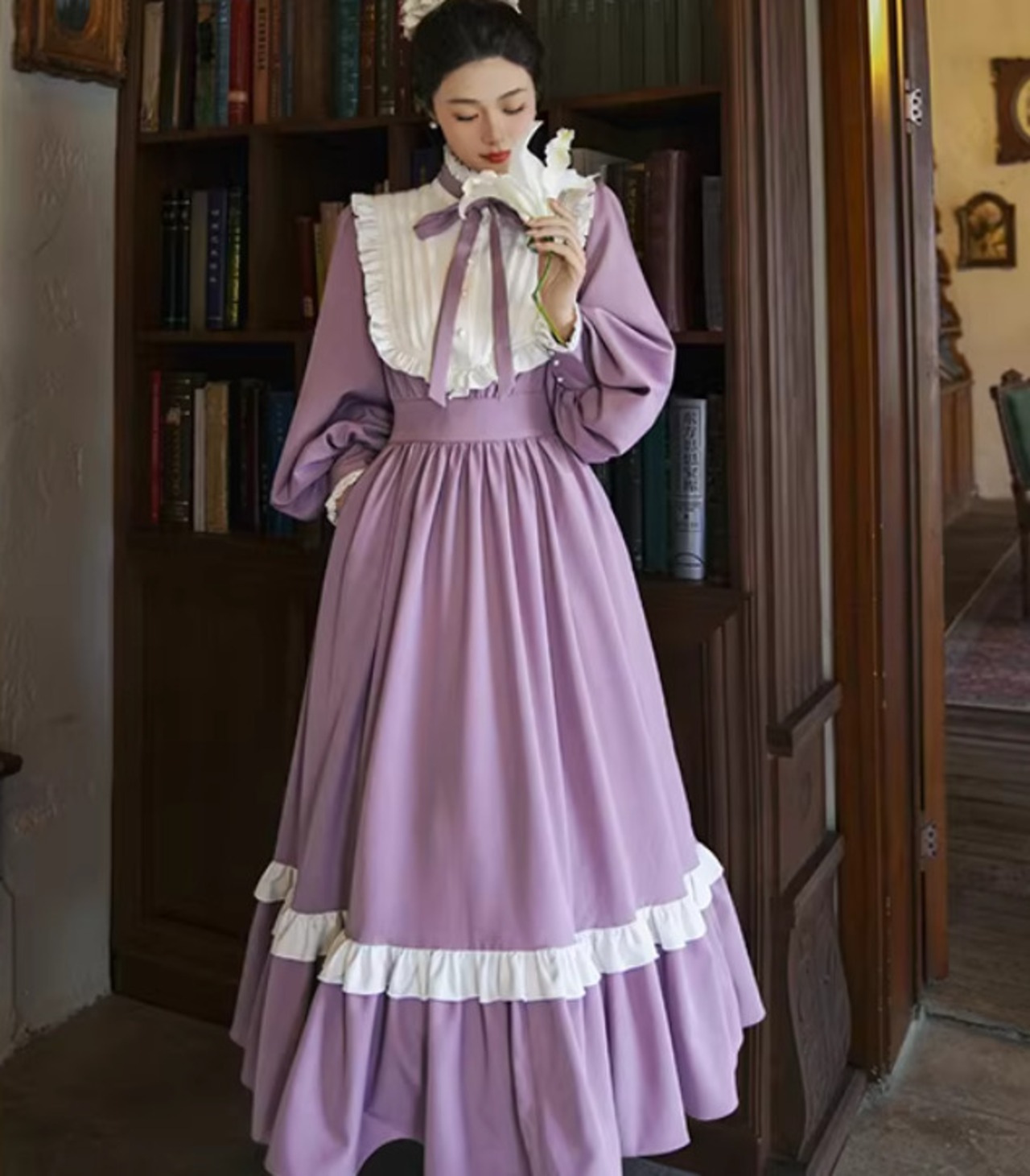 優雅なパフスリーブと清楚なロング丈が魅力のデザインで、