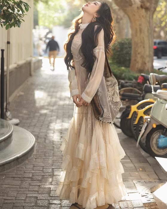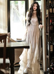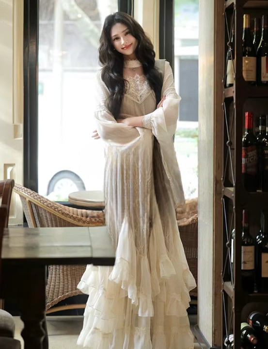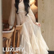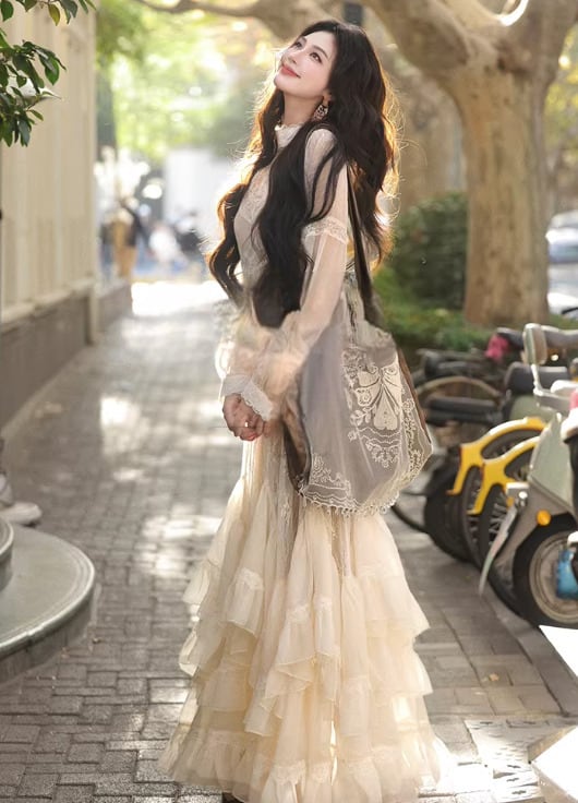 上品なレースとフレアシルエットが特徴で、