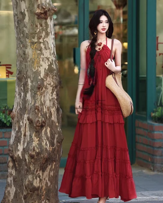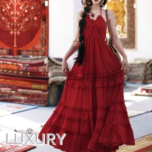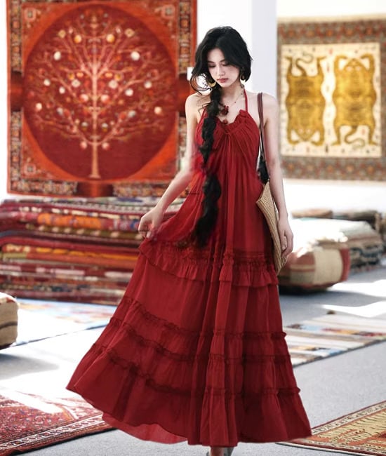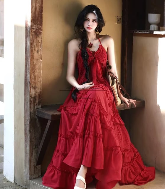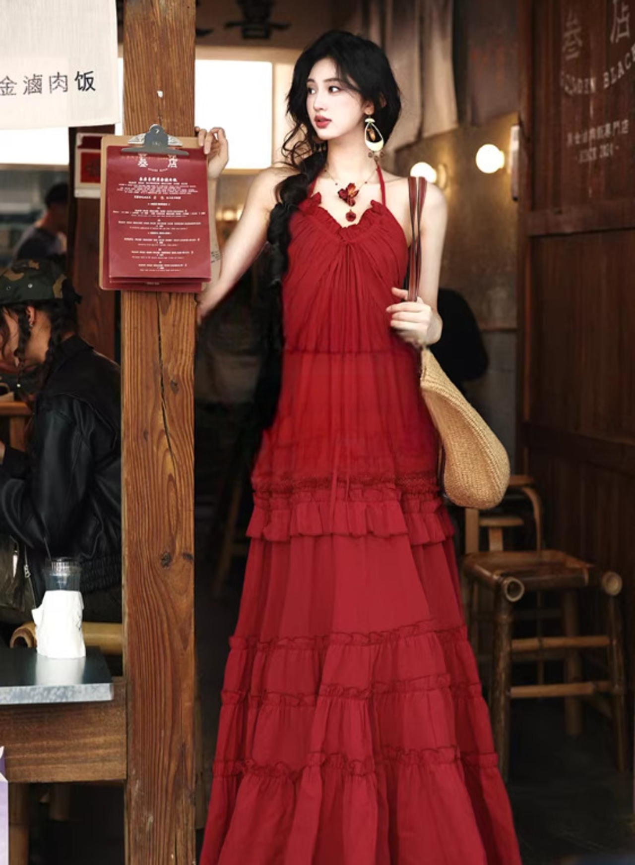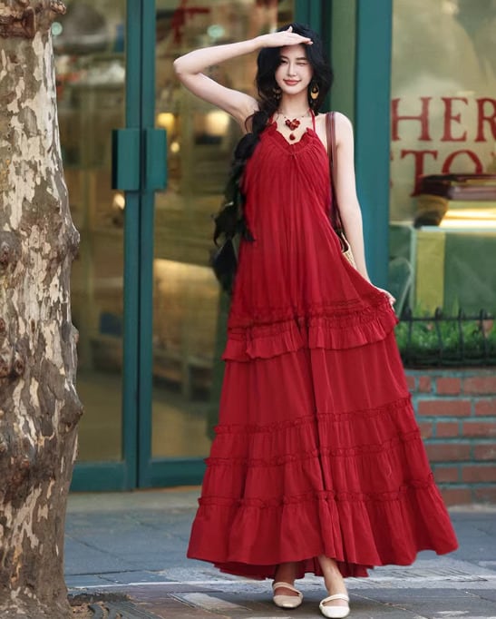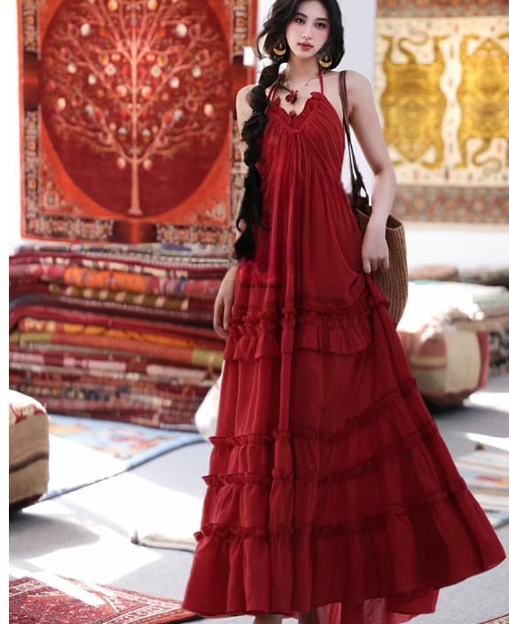 セミロリータ キャミワンピ のみ ホルターネック Vネック ロング丈 バックオープン レトロ 大人可愛い 上品 フェミニン レディースファッション 夏コーデ デイリー お散歩