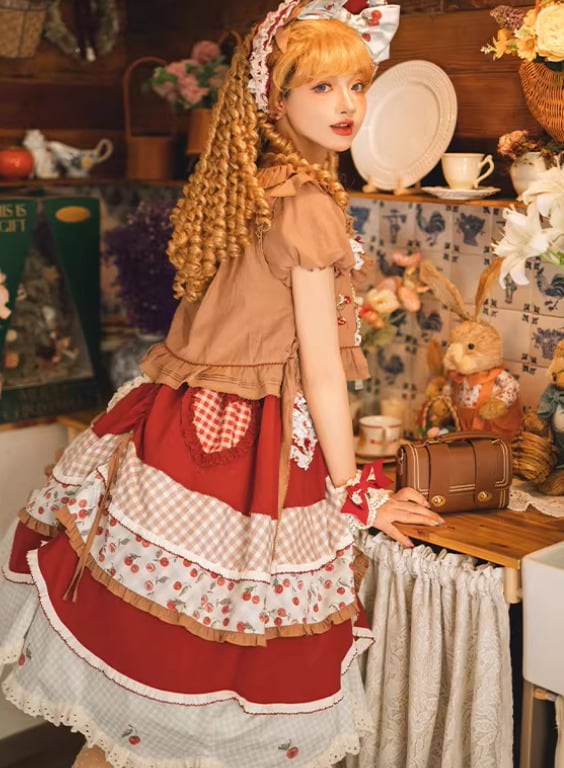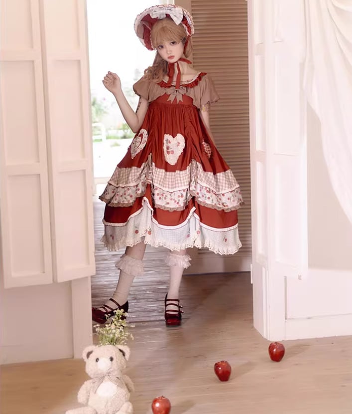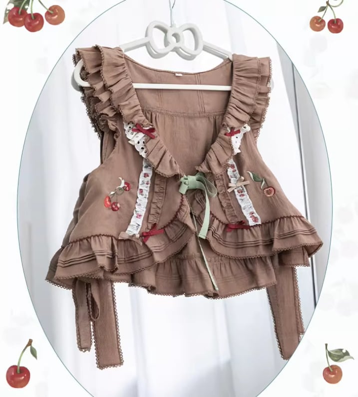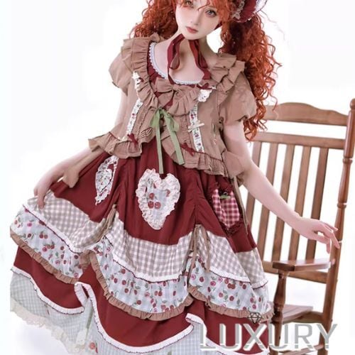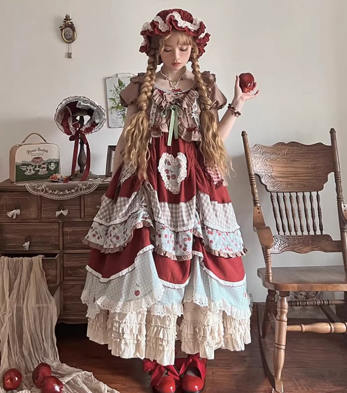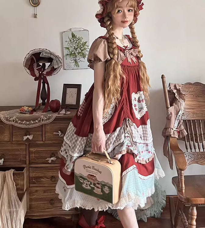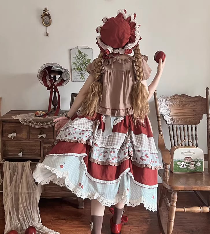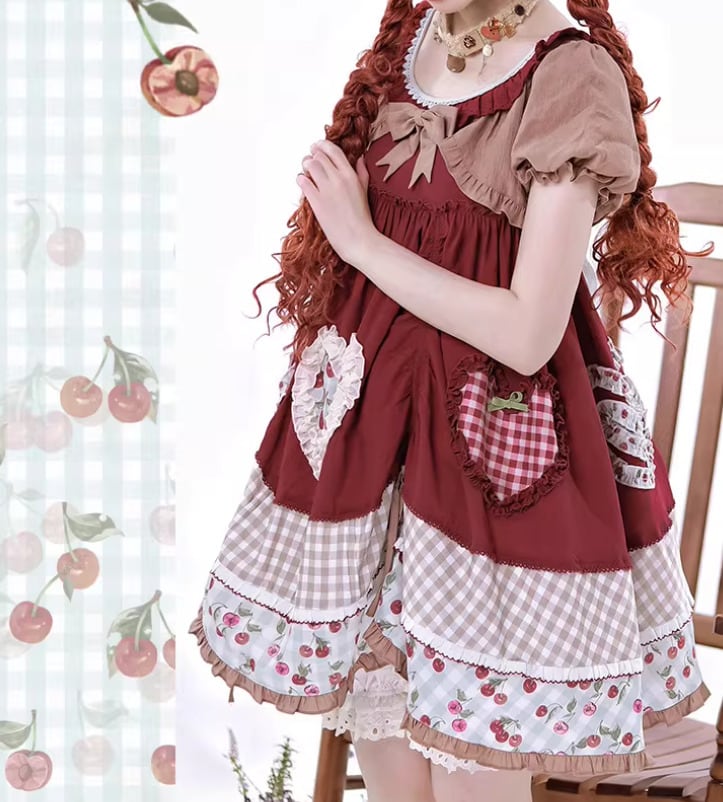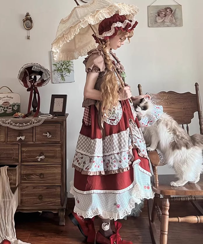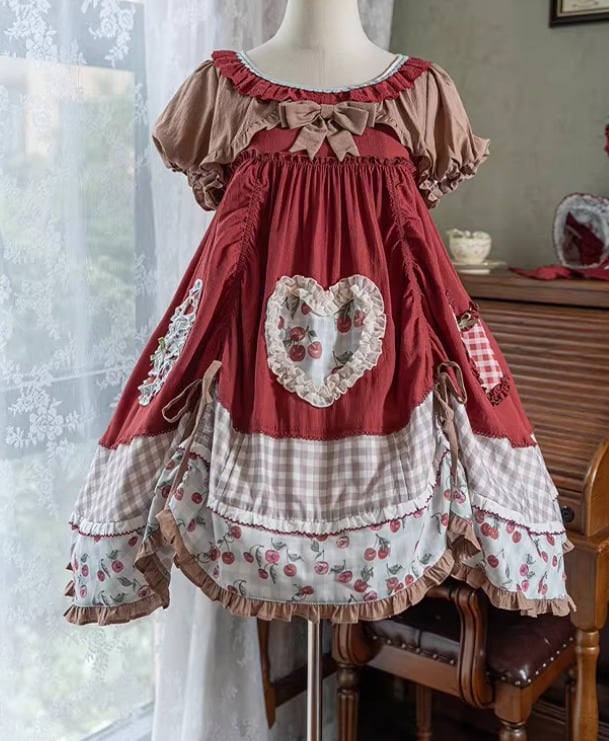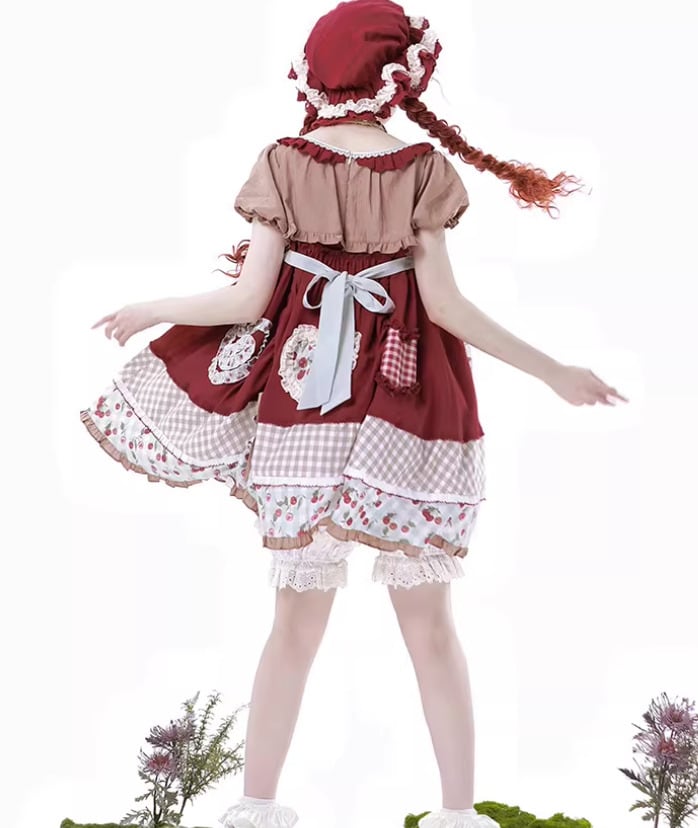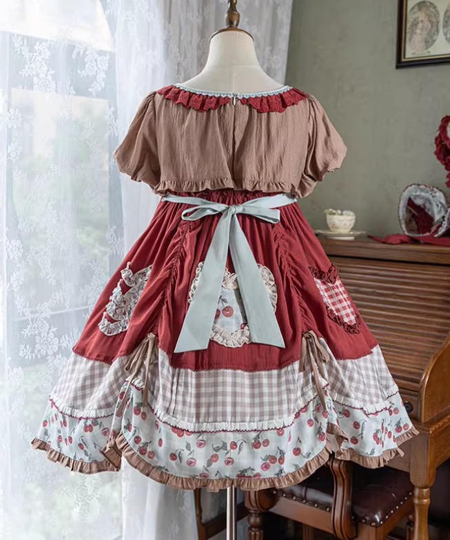 ロリータファッション ワンピース + ボレロ 2点セット 長さ変更可能 チェリー柄 半袖 田園風 カントリー風 レトロ 古風 かわいい 夏コーデ お茶会 森 ピクニック