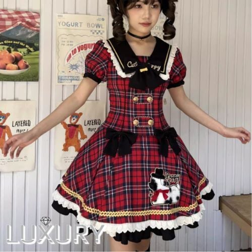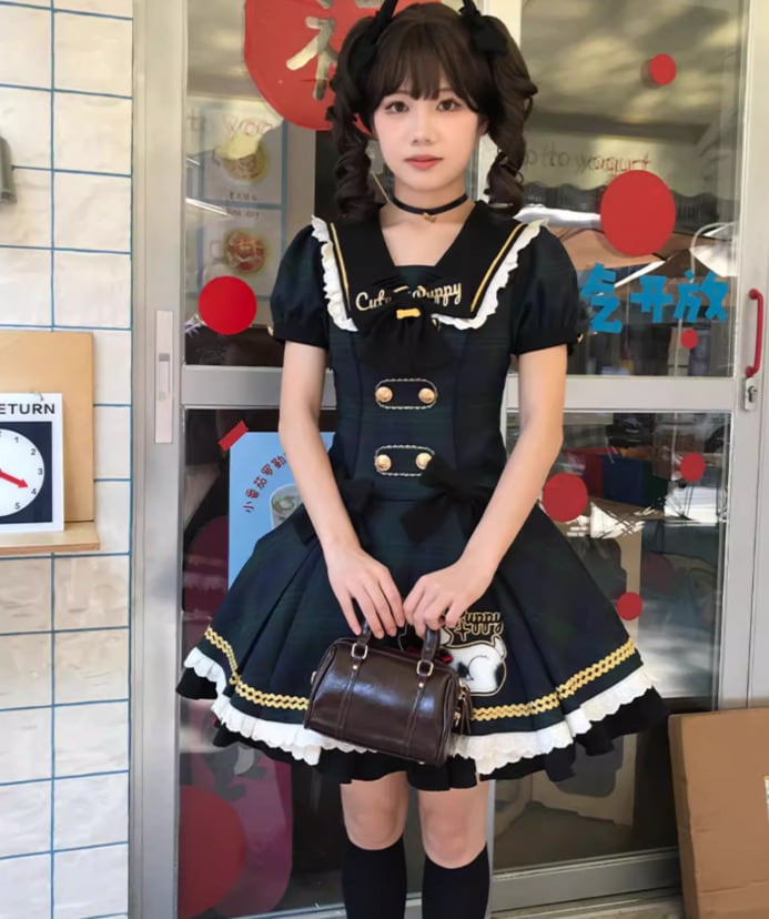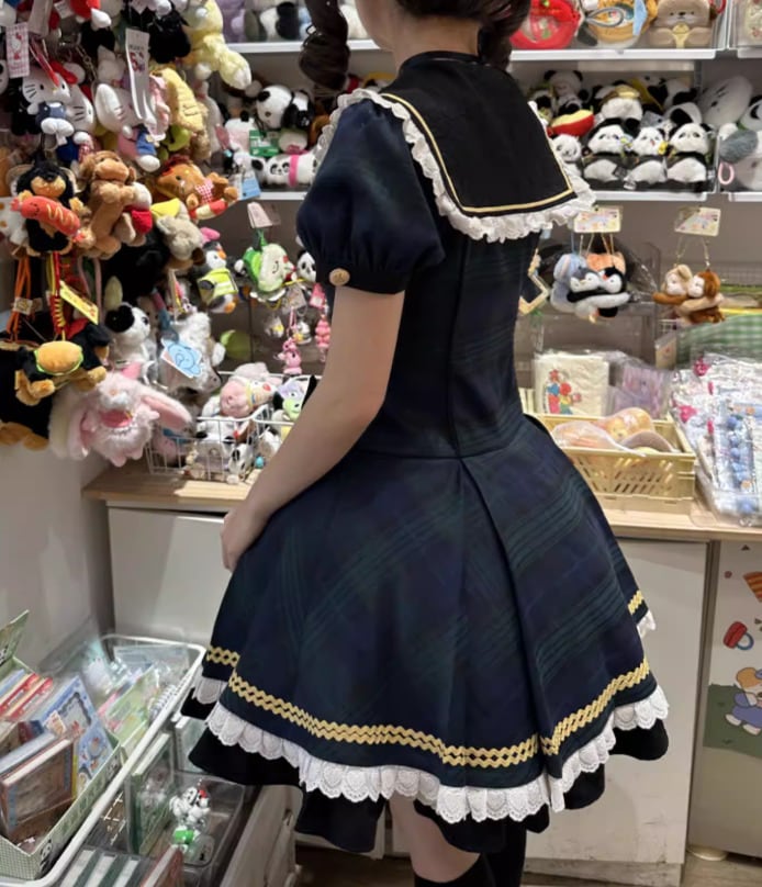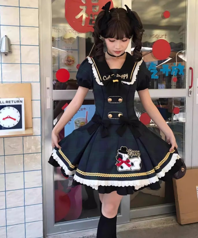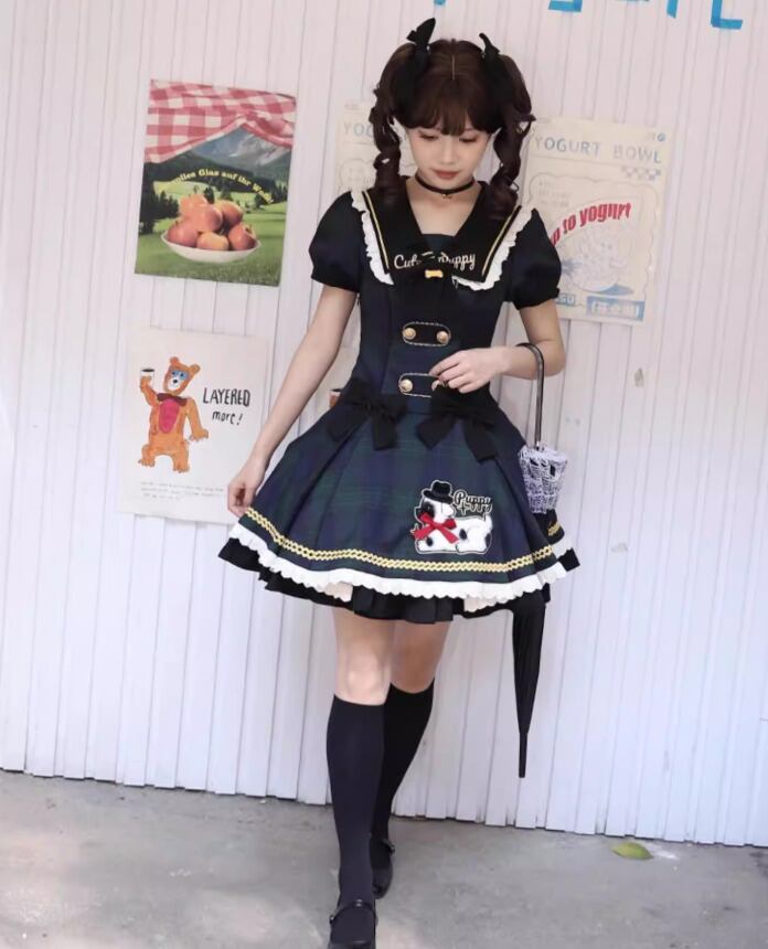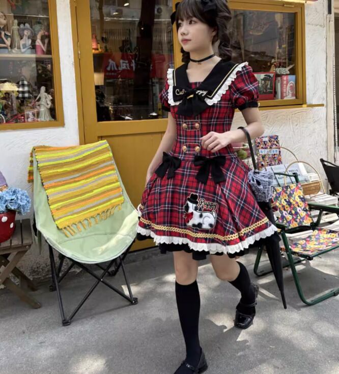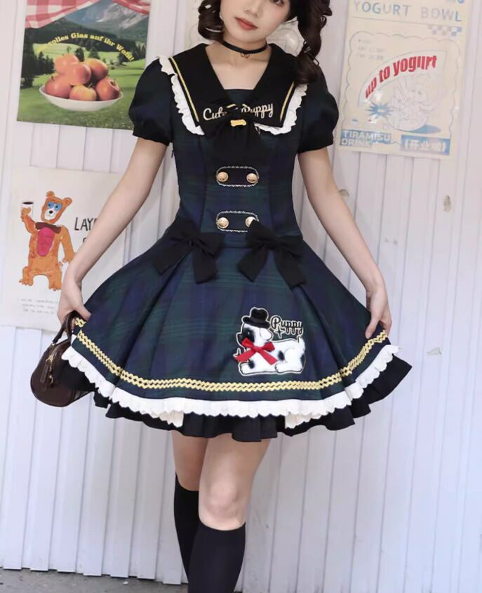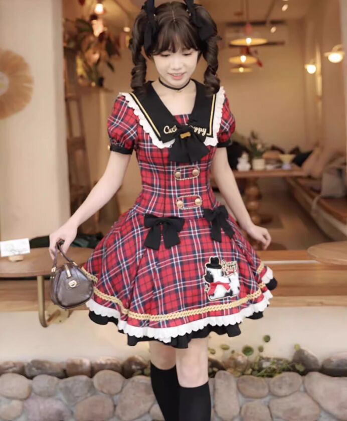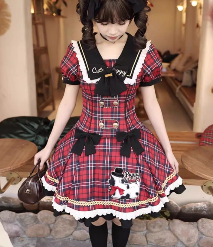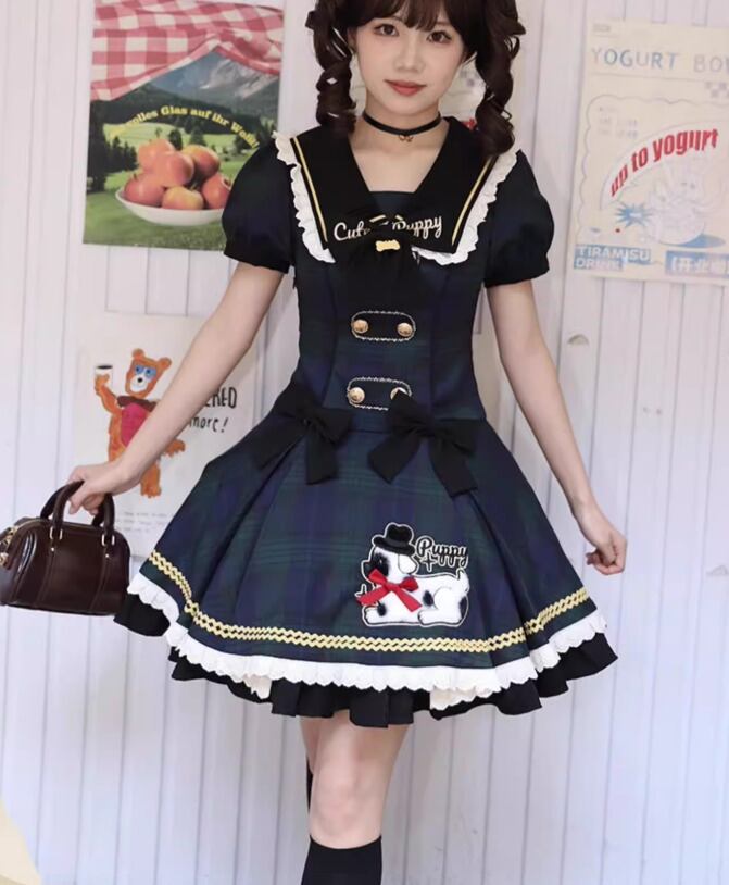 ロリータファッション ワンピース のみ フリル ダルメシアン チェック柄 セーラーカラー 半袖 カントリー風 レトロ 古風 かわいい 春夏秋コーデ お茶会 イベント