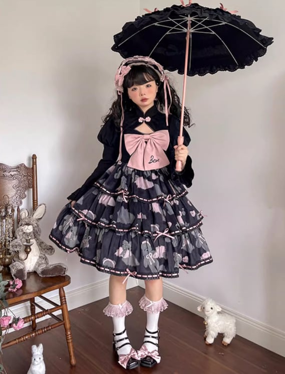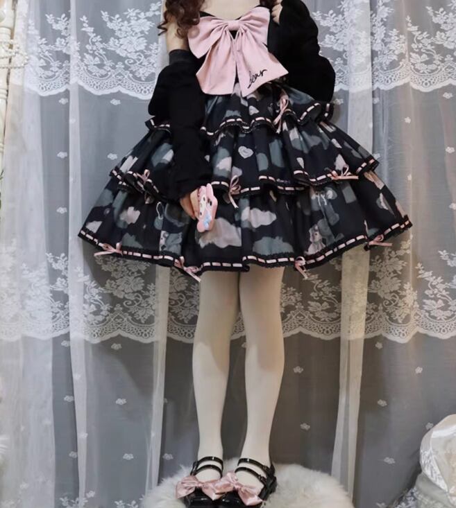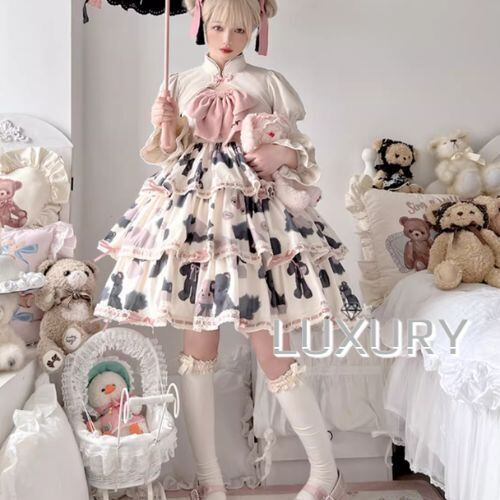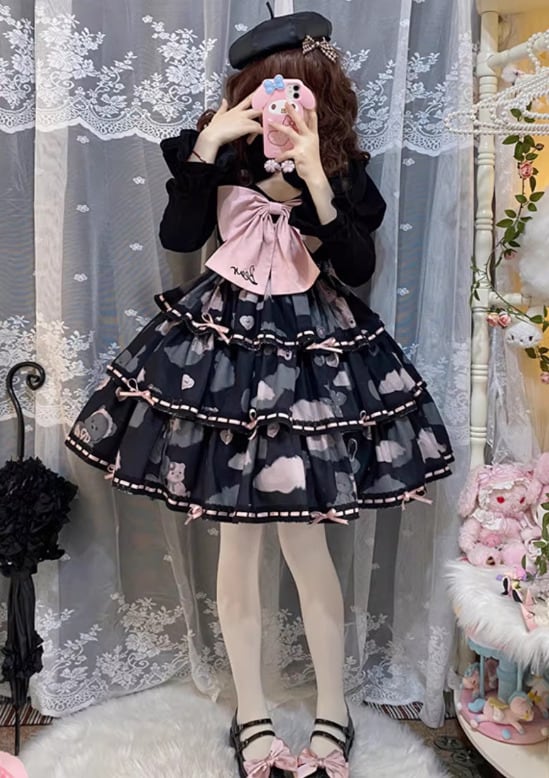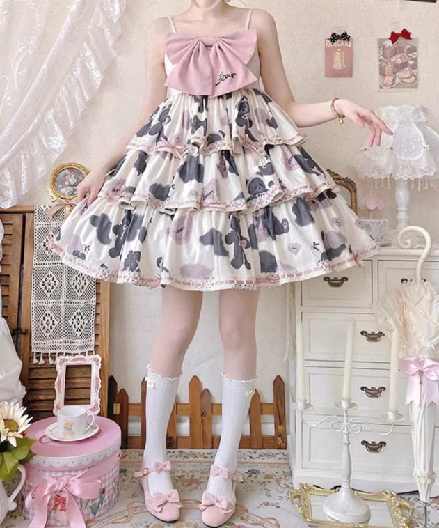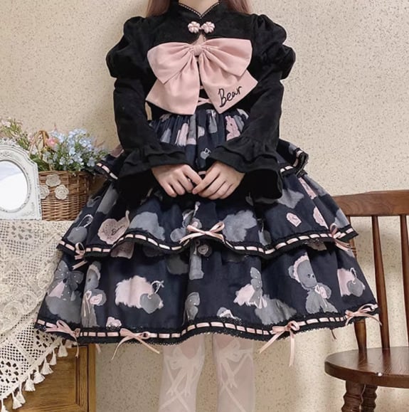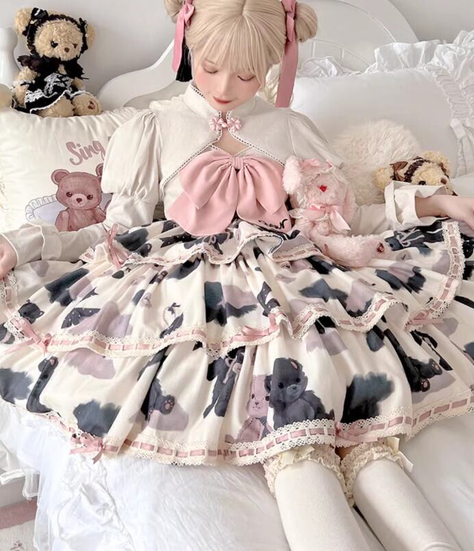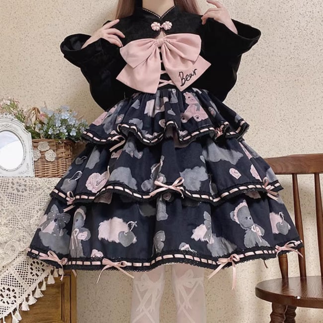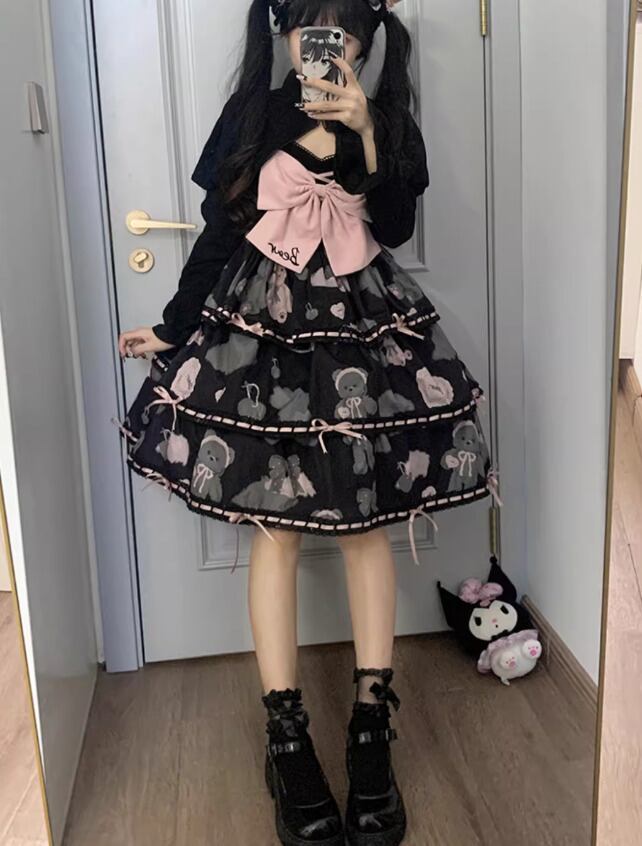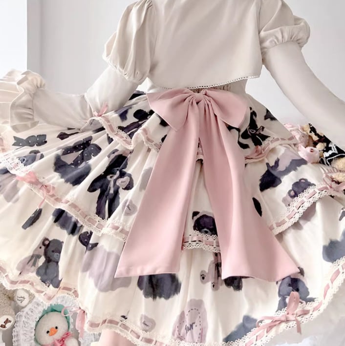 甘ロリ リボン付き ジャンパースカート + ショートジャケット のみ 2色 三段ティアード テディベア プリント お嬢様 かわいい レディース イベント