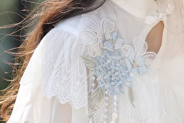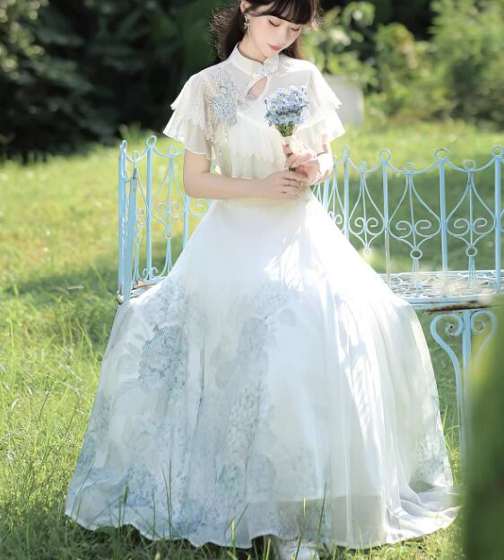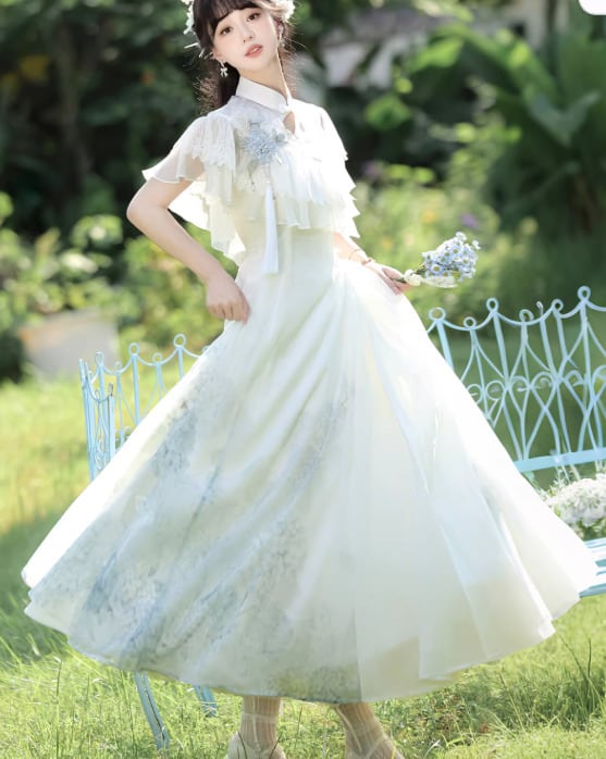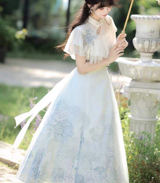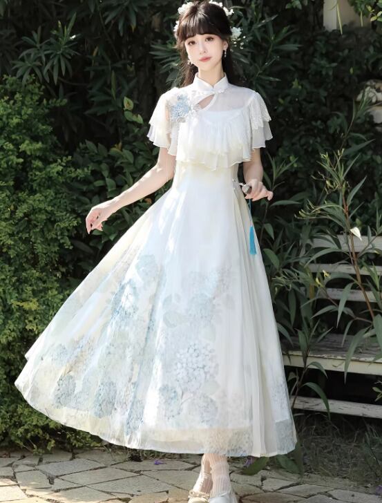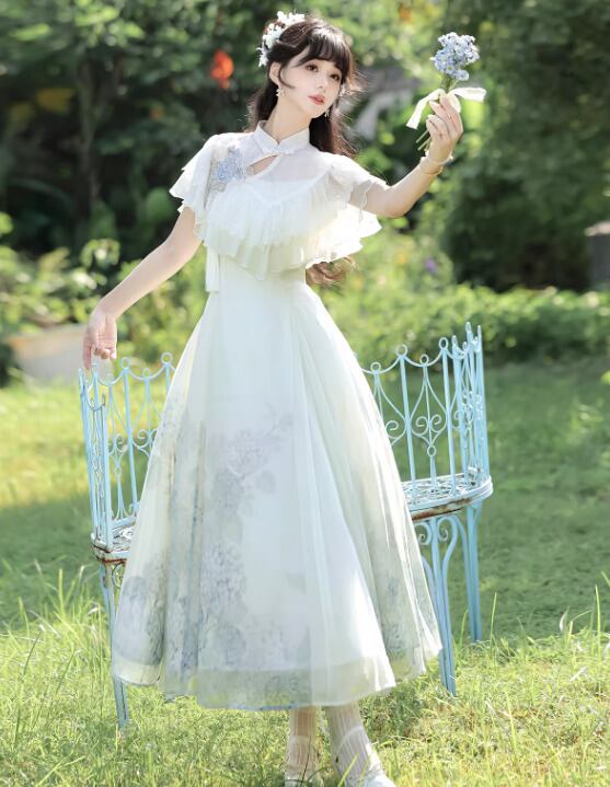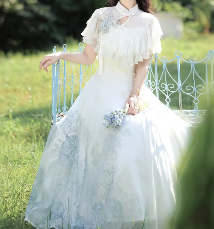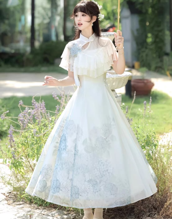クラシカルロリータ クラロリ ワンピース + ショール 2点セット あじさい プリント ロング丈 立ち襟 半袖 上品 中国風 チャイナ 優雅 夏 夏物 夏コーデ 夏服 イベント