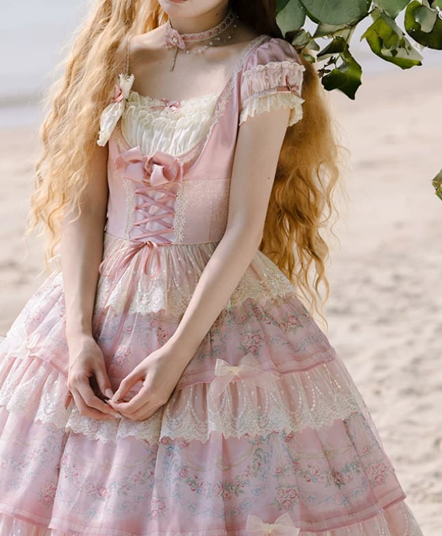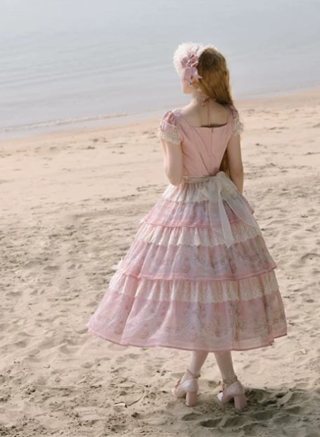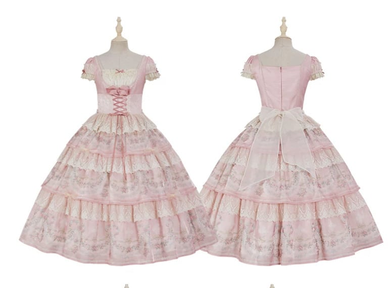 クラシカルロリータ 甘ロリ ワンピース のみ ティアード 半袖 ロング丈 スクエアネック レース お嬢様 かわいい クラシカル 上品 ガーリー レディース お茶会 パーティー