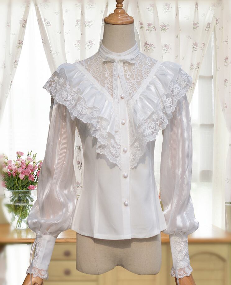 【即納 現品限り】ロリータ ホワイトブラック花嫁ドレスブラウス ブラウスのみ 透け感 レース フリル 白ロリ 黒ロリ loli0683