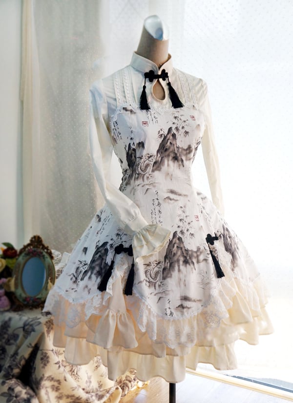 ロリータ チャイナ カラー長袖ワンピース OP ワンピ 水墨画風 華ロリ フリル リボン ホワイト cnalb20381