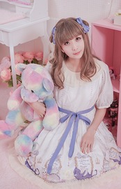 ロリータ/半袖ワンピース/ピンク/ブルー/ホワイト/ネコ/パステルカラー/マカロンカラー/膝丈/夏/シフォン/甘ロリ/ドレス/ロリータドレス/かわいい/フリル/レース/ひらひら/ワンピース/リボン