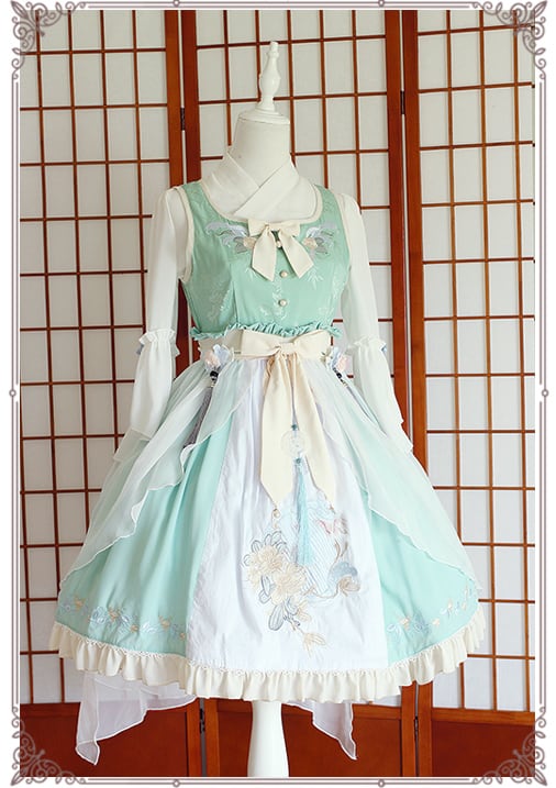 ロリータ/ジャンパースカート/中華ロリ/華ロリ/グリーン/パープル/刺繍/パール/シフォン/ジャンスカ/jsk/ドレス/かわいい/フリル/レース/ひらひら/ワンピース/ハイウエスト/リボン