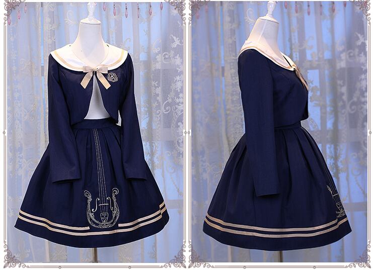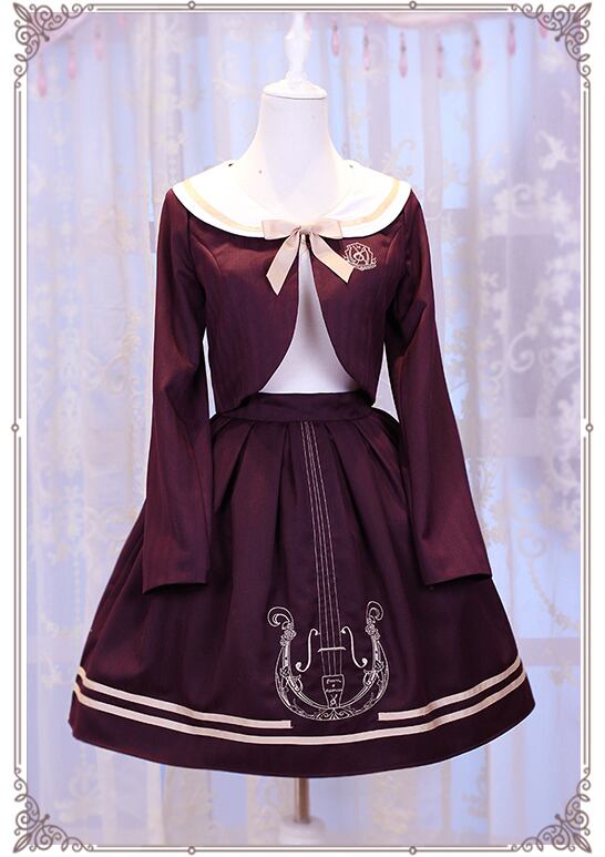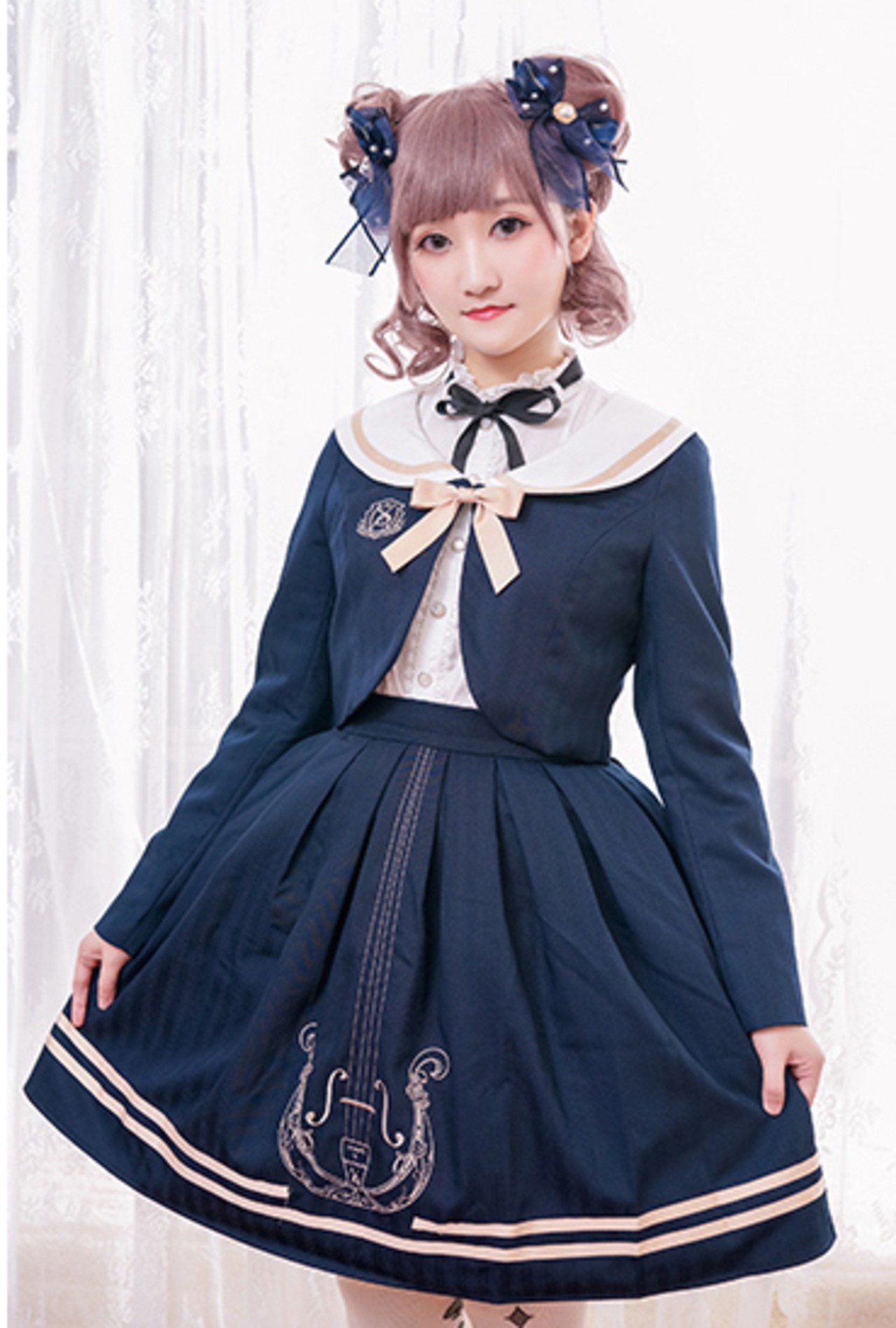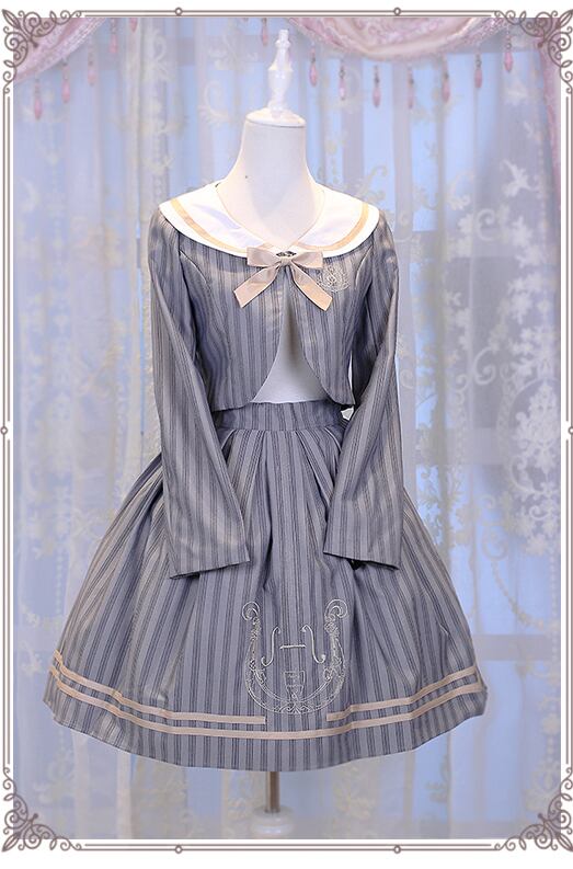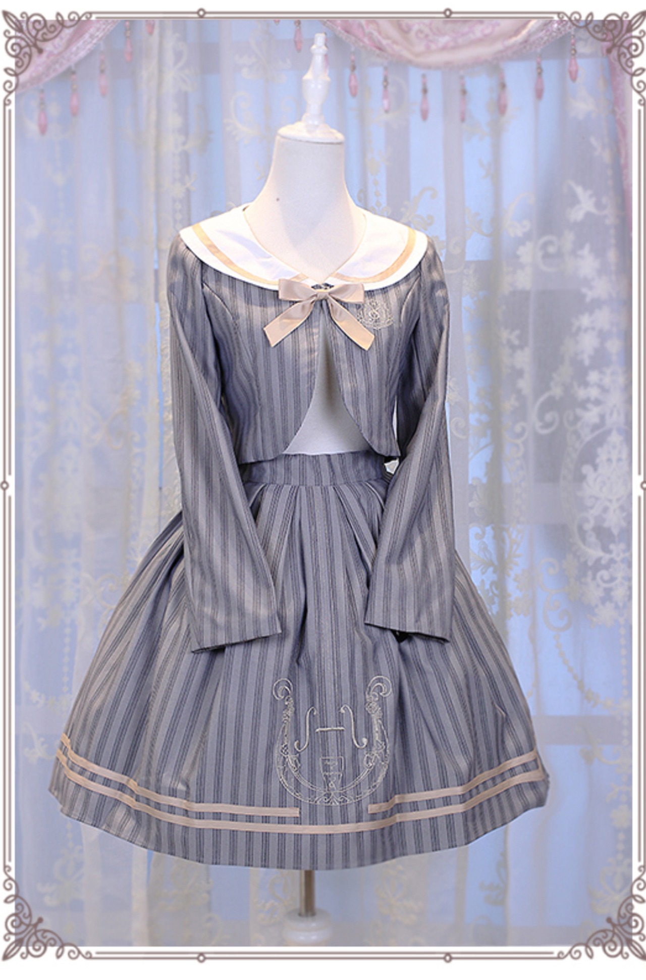 ロリータ/ジャケット/スカート/セットアップ/制服/ストライプ/ネイビー/グレー/ワインレッド/ギター/刺繍/甘ロリ/ロリータドレス/クラシカル/クラシック/かわいい/フリル/レース/ひらひら/リボン