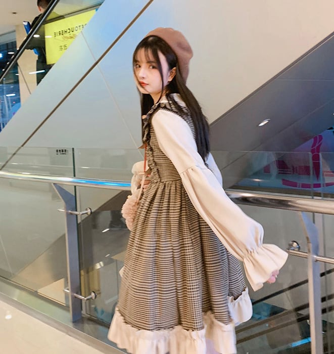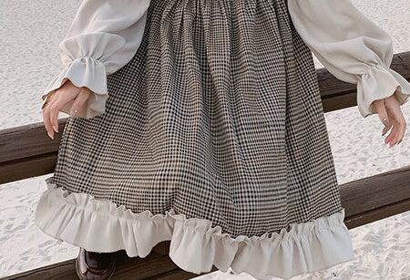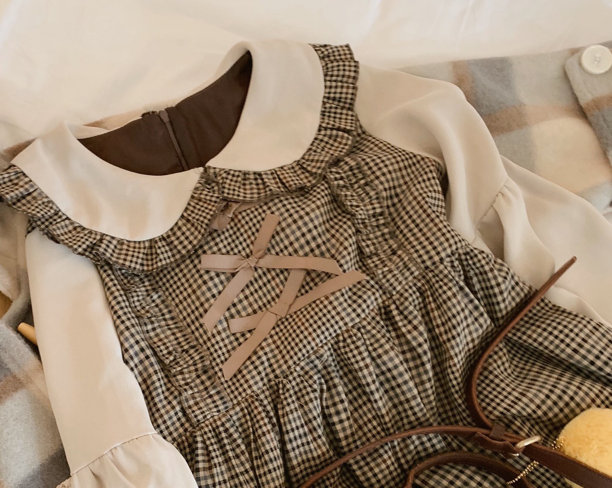 ロリータ/ロリィタ/甘ロリ/ワンピース/ワンピ/OP/ドールワンピ/ドール/お人形さん/長袖/フリル/リボン/レース/チェック/チェック柄/格子柄/少女/森/ひざ下丈/ミドル丈/ミディ丈/膝下