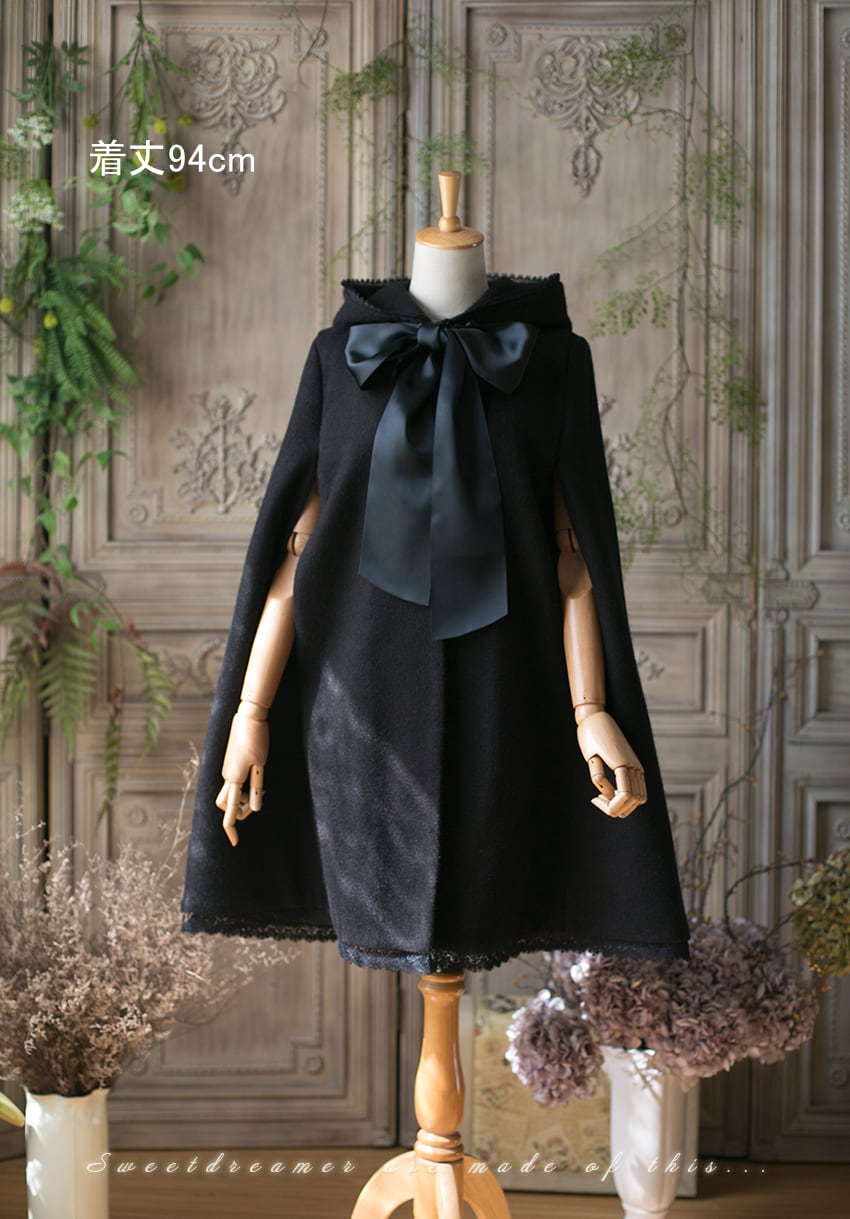 ロリータ/ロリィタ/黒ロリ/ゴスロリ/クラロリ/マント/コート/マントコート/袖なし/アウター/リボン取り外し可能/フード付き/魔女/魔法使い/貴族/王宮/宮廷/姫/クラシカル/着丈94cm