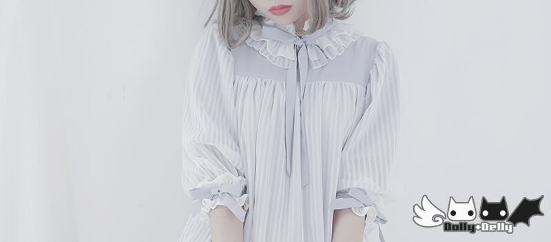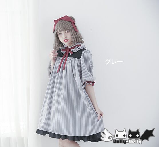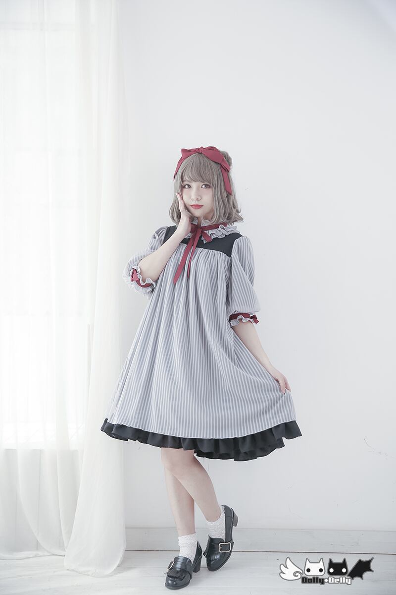 Dolly Delly ロリータ ドールワンピース 半袖 ダブルフリルカラー リボン スモッグ 膝丈 Aライン ストライプ loli1251