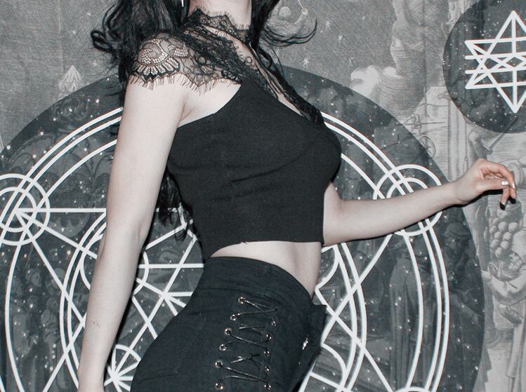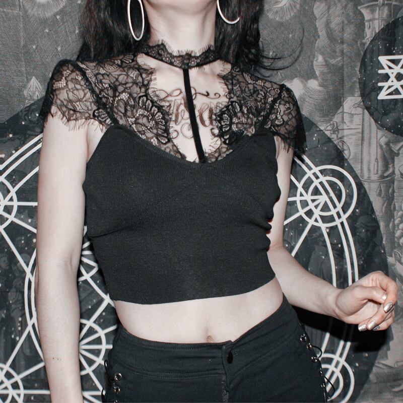 ゴスロリ ブラックレース トップス セクシー ショート丈 ゴシックカジュアル へそだし 夏物 ホルダーネック loli1385