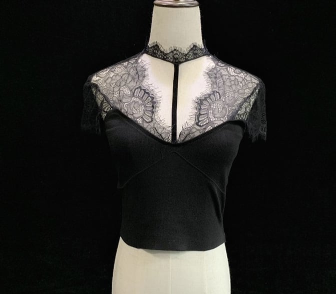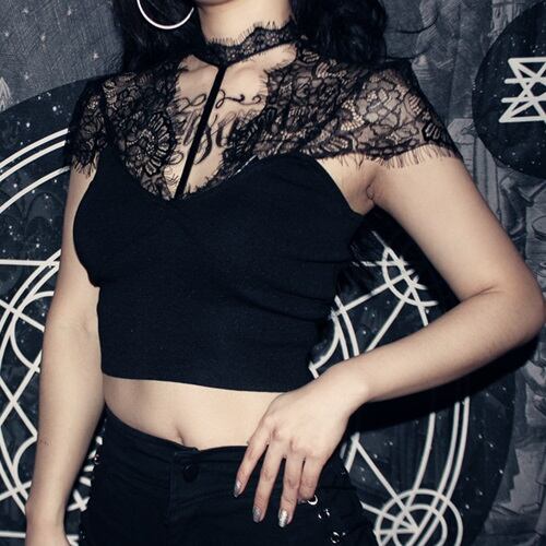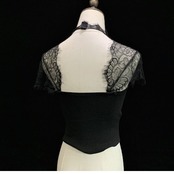 ロリータファッション/ロリータ/レディース/カジュアルロリータ/ゴシックカジュアル/ブラックレース/トップス/半袖/ホルダーネック/タイト/へそだし/ボタン付き/ギャル/ショート丈/クール/ゴスロリ/夏物/レース