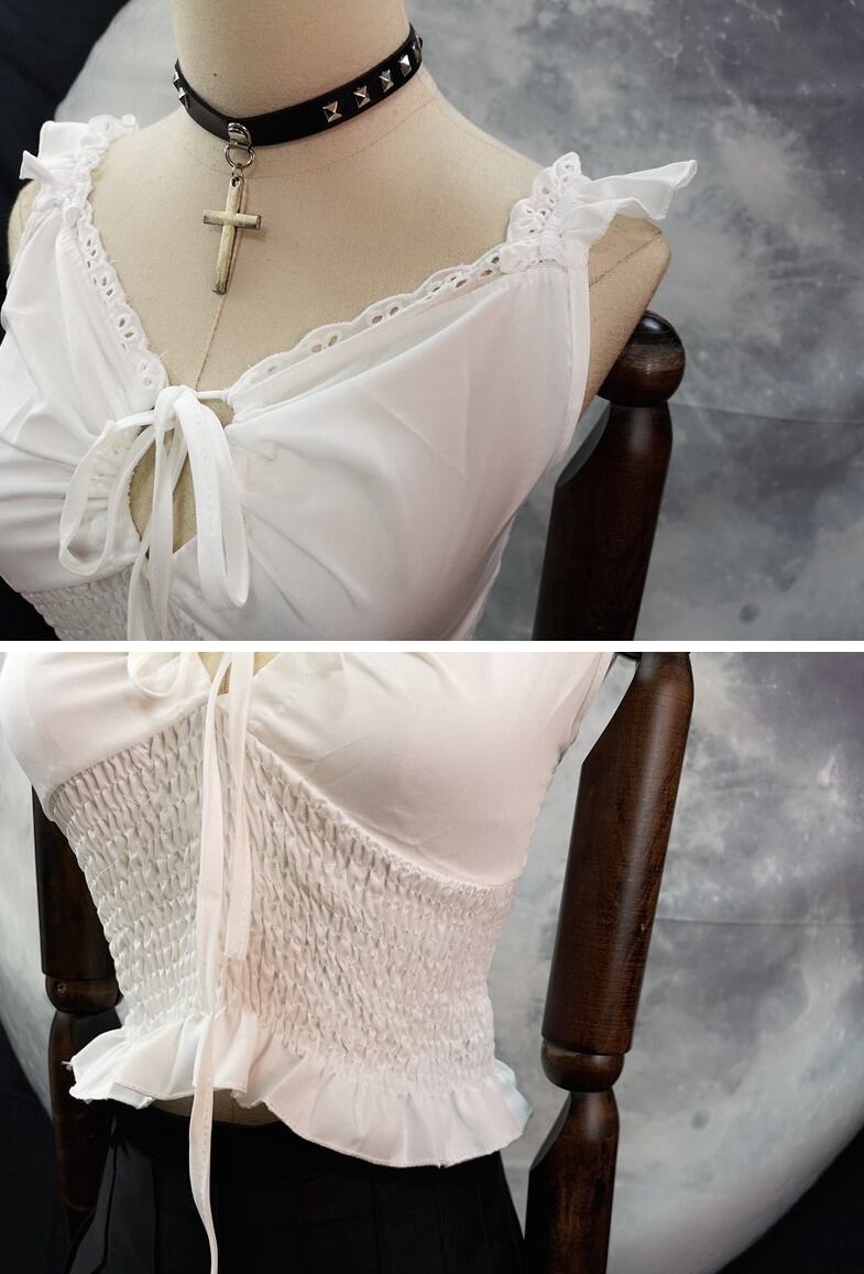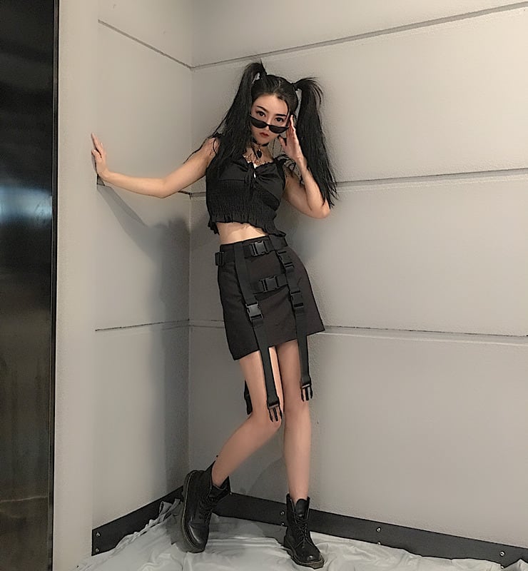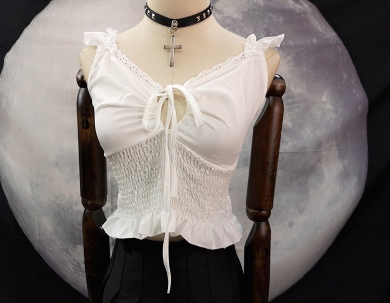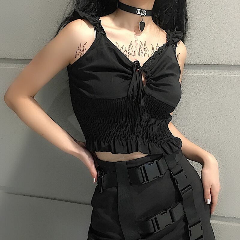 ロリータファッション/ロリータ/レディース/カジュアルロリータ/ゴシックカジュアル/トップス/ノースリーブ/フリル/ブラック/タイト/夏物/セクシー/パンク/ショート丈/原宿系/クール/ゴスロリ/春夏
