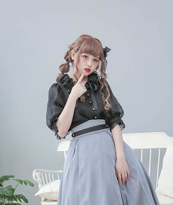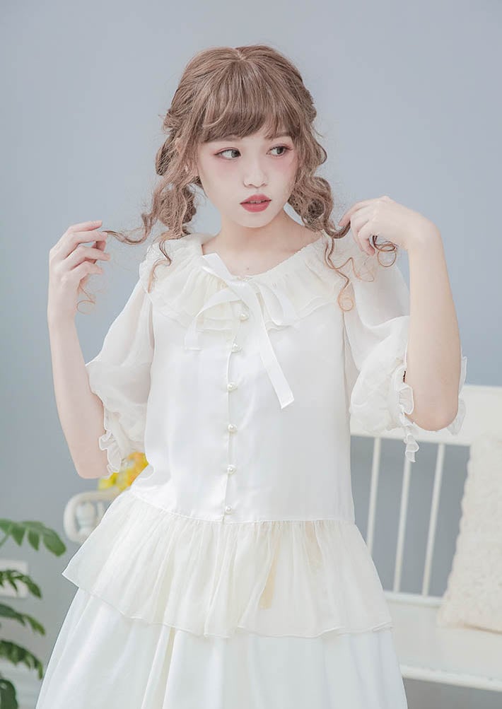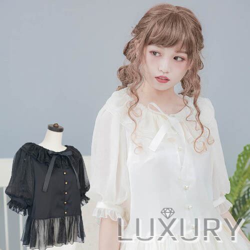 ロリータ Dolly Delly 単色ブラウス シースルー袖 透け感 フリル リボン 夏物 カジュアル 甘ロリ 白ロリ 黒ロリ loli1863