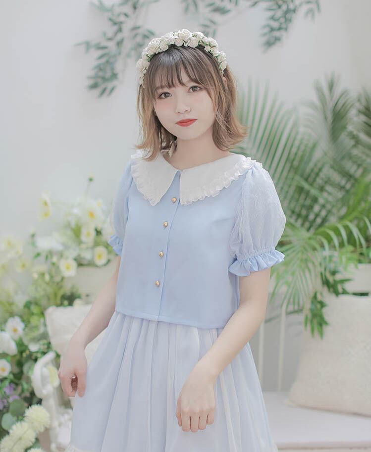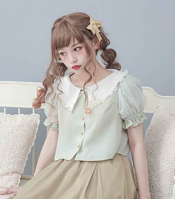 淡いスイートカラーの5分袖ブラウスです。パフスリーブがとってもガーリーな雰囲気にしてくれます。透け感のある生地なので優しいふんわりとした雰囲気になります。/ロリータファッション/ロリータ/レディース/ブラウス/半袖/透け感/シースルー/リボン/透け/パフスリーブ/提灯袖/マカロンカラー/ジェラートカラー/ゆめかわ