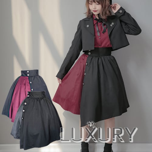 不規則な丈の変形スカート。ダークカラーなので重厚感のあるクラシカルなスタイルにしてくれます。/ロリータファッション/ロリータ/レディース/スカート/ゴスロリ/変形スカート/不規則丈/燕尾/クラシカル/かっちり/ボタン