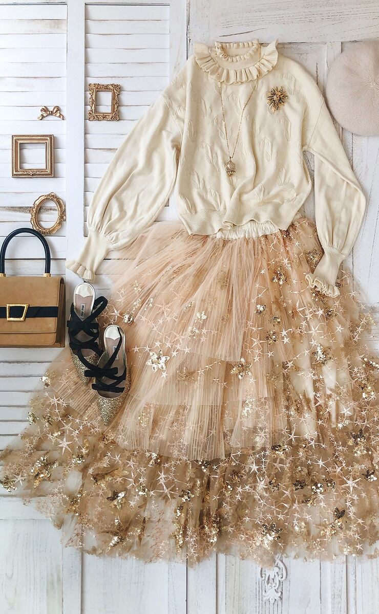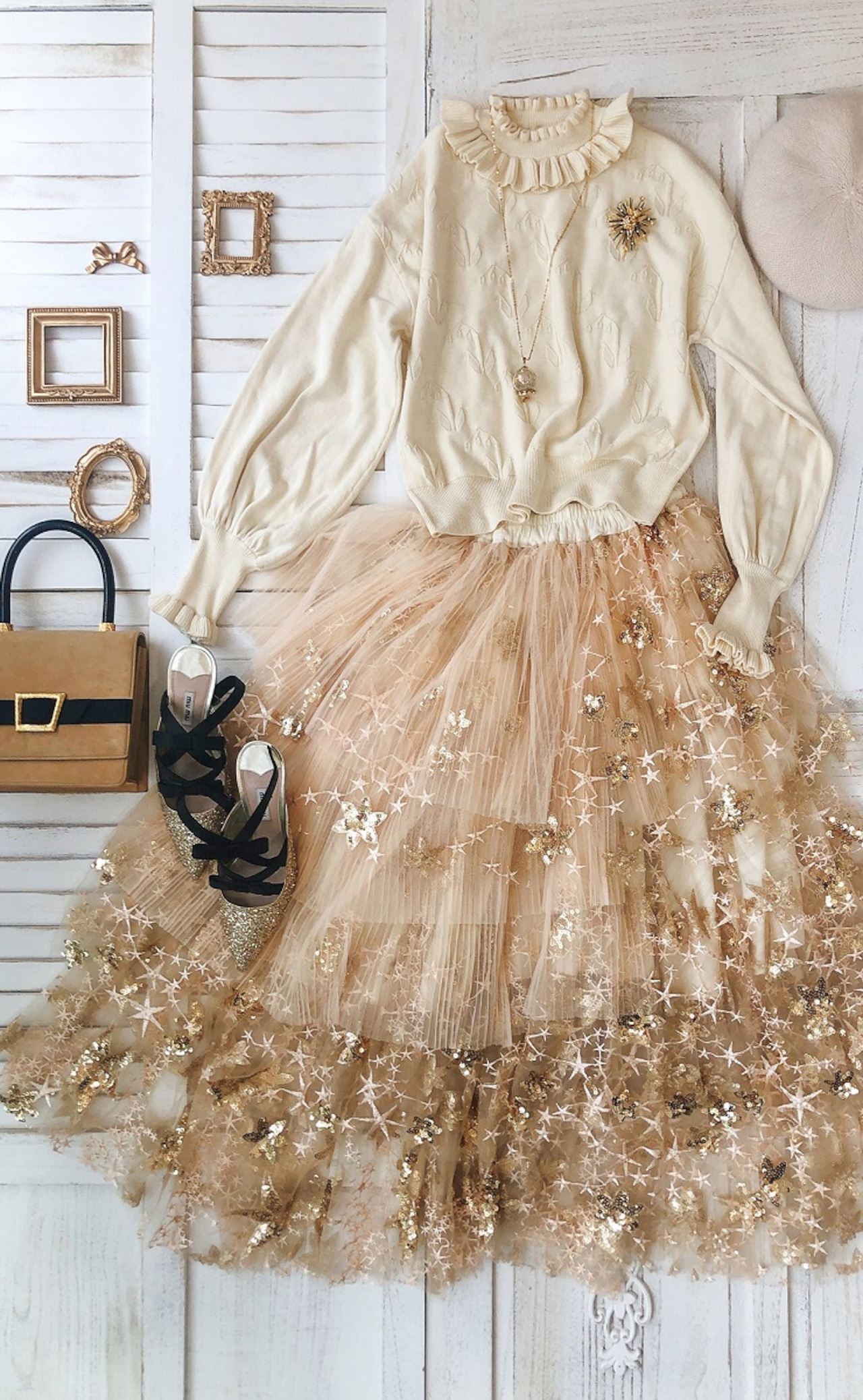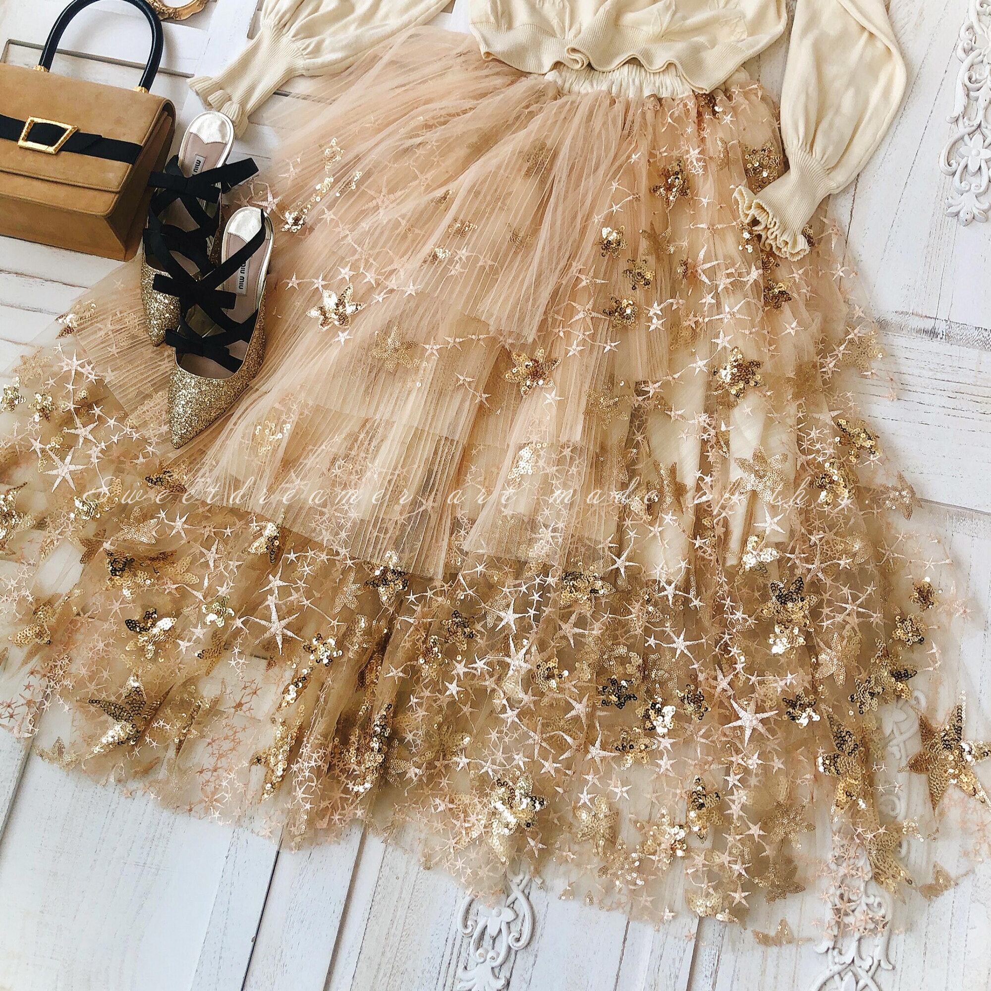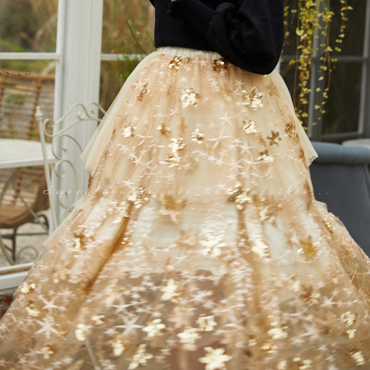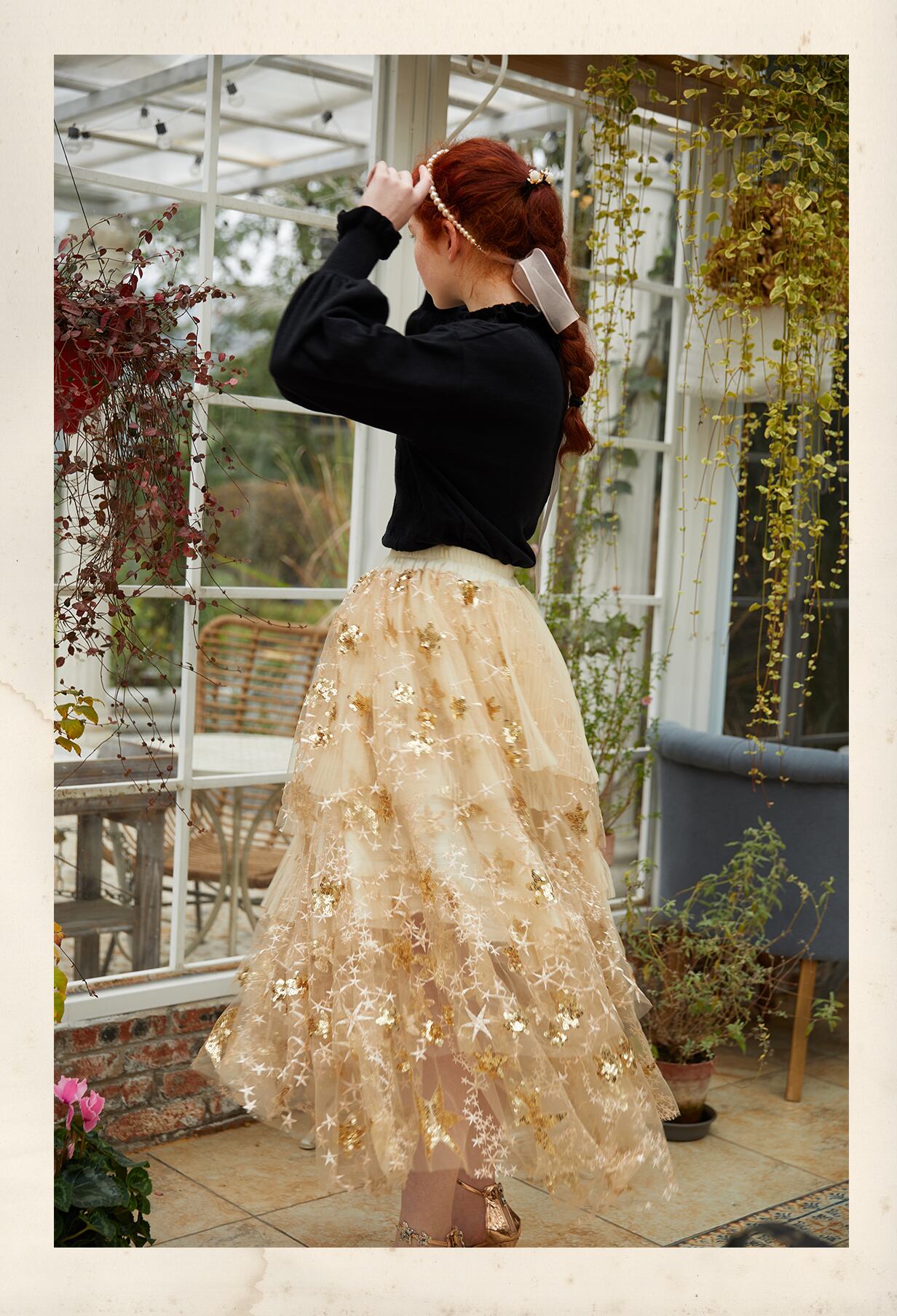 ロリータ/スカート/オーダーメイド/ロング/スパンコール/シャンパンゴールド/シフォン/星/キラキラ/クラシカル/上品/ウエストゴム/ストライプ/SweetDreamer