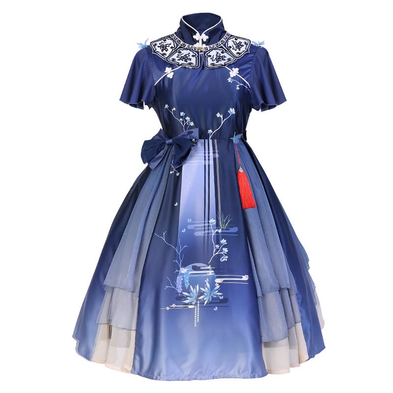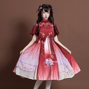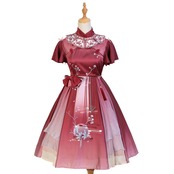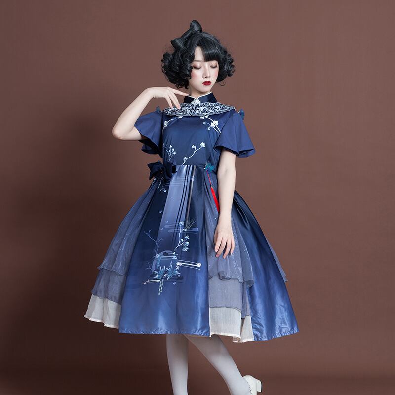 ロリータ/華ロリ/ワンピース/膝丈ワンピース/ブルー/レッド/つけ襟/フリル/花/フラワー/リボン/チャイナ服/シフォン/夏