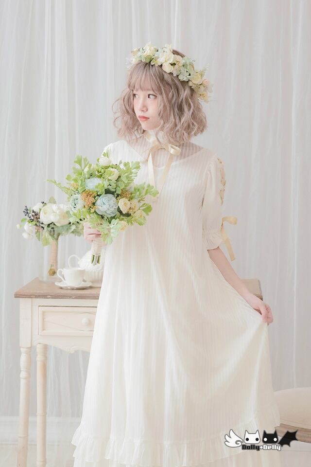 ロリータ/ワンピース/半袖/ホワイト/ブラック/夏/編み上げ/クルーネック/リボン/フリル/フレア/ストライプ/シースルー/DollyDelly/カジュアル/甘ロリ/膝丈ワンピース/マキシワンピース