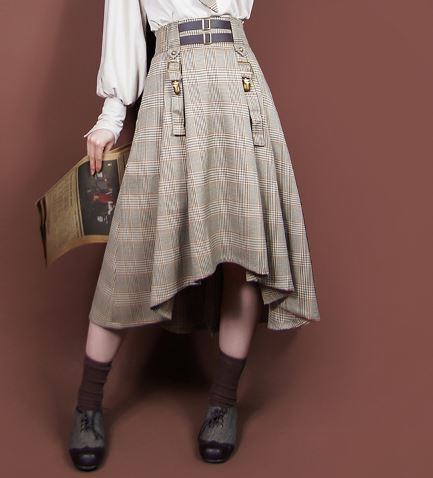 ロリータ スカート アシンメトリー ミディアム リボン チェック カーキ カジュアル レトロ ロリータファッション loli2242