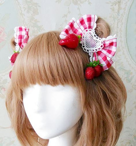 ロリータファッション/ロリータ/Lolita/髪飾り/ヘアピン/2個セット/いちご/ギンガムチェック/リボン/カジュアル/華やか/上品/ヘッドドレス/ヘアアクセサリー/ファッション雑貨/小物/パーティ/お呼ばれ/ユメ可愛い/人気/トレンド/おでかけ/パーティ/お呼ばれ/ダンス/茶話会/春夏/ゴスロリ/韓国ファッション/おしゃれ/デート