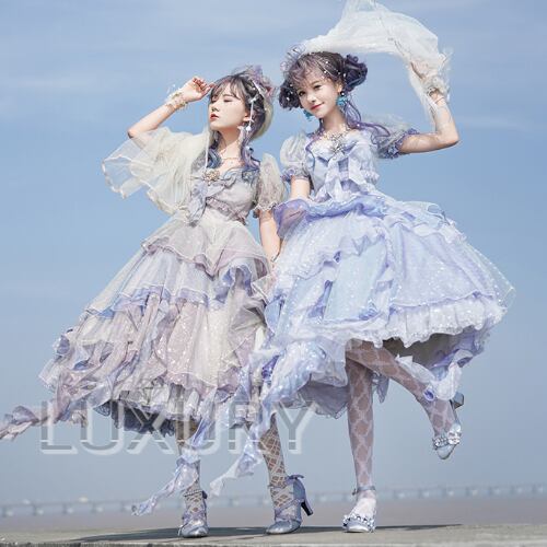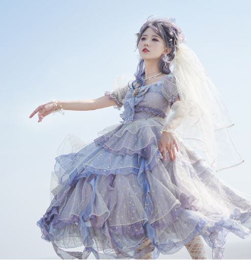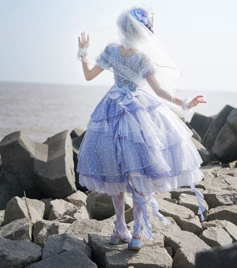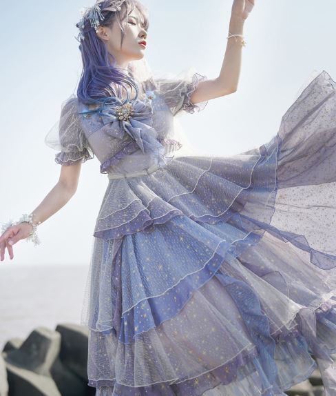 ロリータファッション/ロリータ/Lolita/ワンピース/ドレス/ふんわり/ブルー/パープル/星/ヒトデ/シェル/ミディアム/ひざ下丈/半袖/リボン/ビジュー/キラキラ/大きいサイズ/サイズ豊富/かわいい/ガーリー/ミディアム/ひざ丈/フレア/Aライン/キュート/ラブリー/レース/フリル/パーティ/ユメ可愛い/人気/トレンド/おでかけ/パーティ/お呼ばれ/ダンス/茶話会/春夏/ゴスロリ/韓国ファッション/おしゃれ/デート