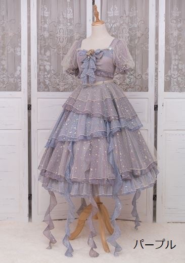 ロリータ ドレスワンピース2色 ブルー パープル ふんわり フレア ミディアム フリル 半袖 ビジュー リボン 星 キラキラ シェル ヒトデ モチーフ チュール ひざ下丈 パーティ 海 春夏 茶話会 甘ロリ ロリータファッション loli2691