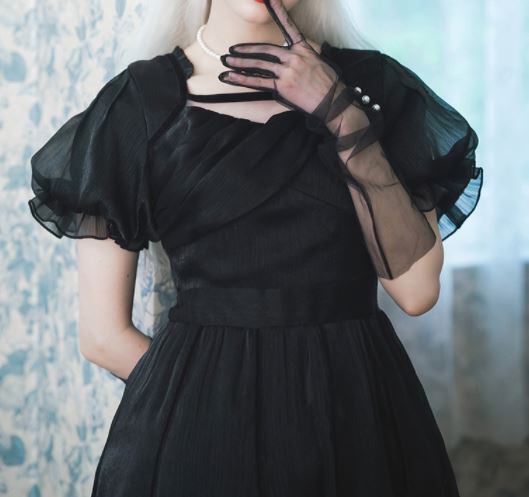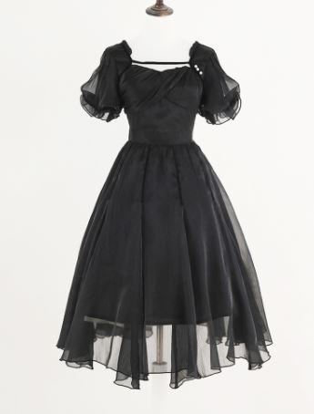 ロリータファッション/ドレス/ワンピース/ブラック/フレア/半袖/バックコンシャス/パフスリーブ/レトロ/エレガント/甘ロリ/クラシカル/クラロリ/お姫様/姫ロリ/かわいい/秋/秋物/秋服/冬/冬物/冬コーデ/冬服/お茶会/撮影/舞台/撮影用/ハロウィン/クリスマス/バレンタイン/イベント/結婚式/ウェディング/二次会/謝恩会/お呼ばれ/パーティー/デート