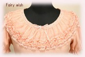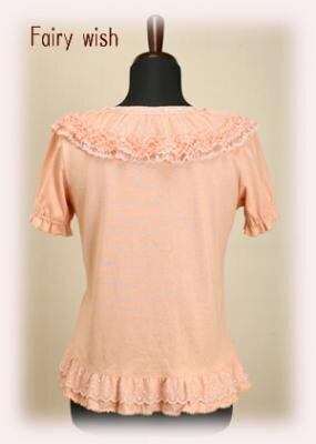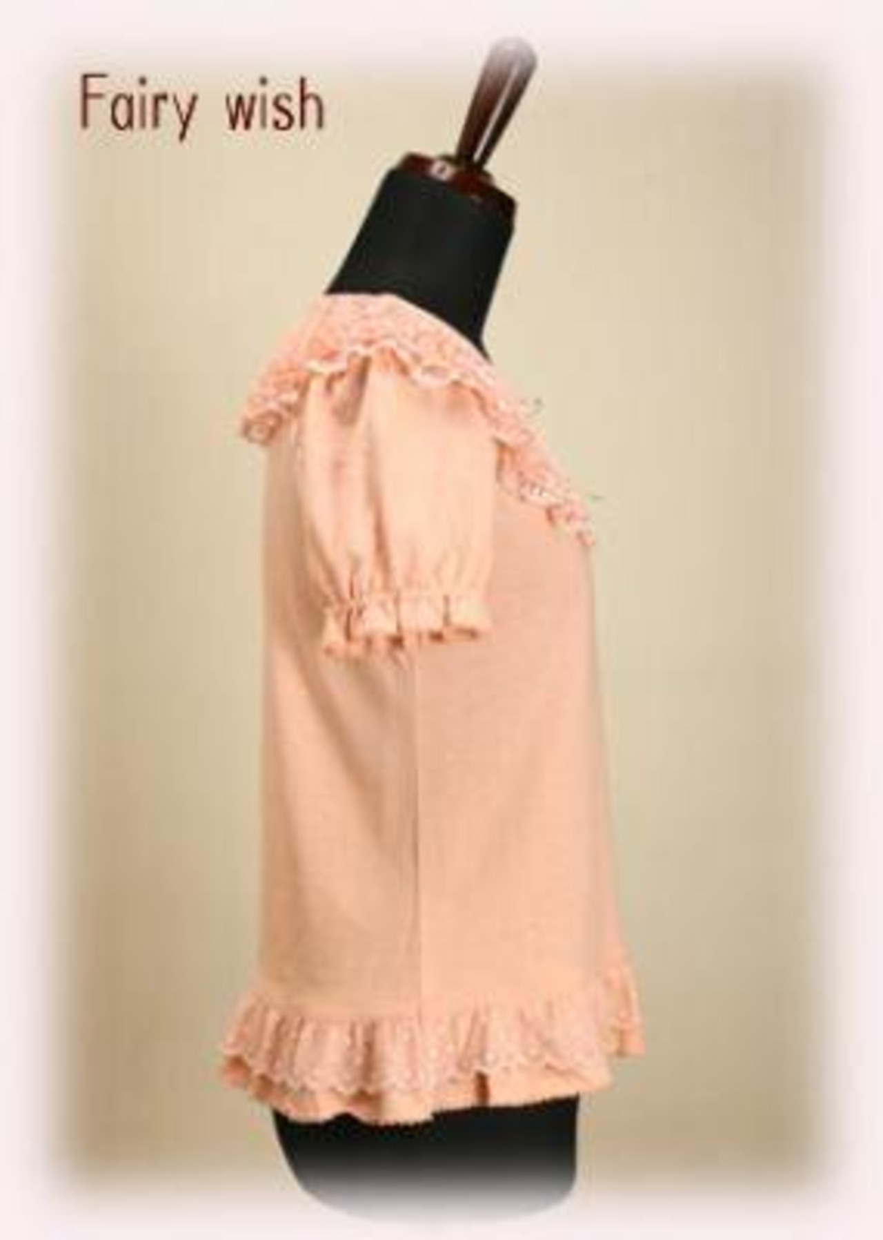 襟ぐりのリボンや、袖口と裾のフリルに施されたピコレースなど、可愛らしさを追求したカットソーです。