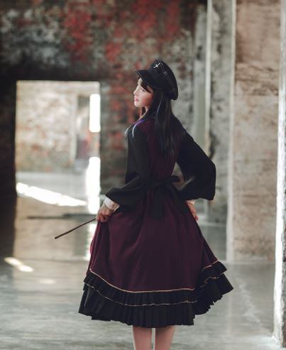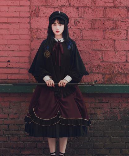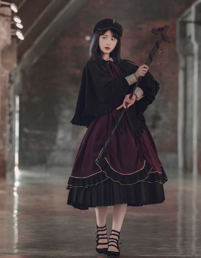 ロリータファッション/ワンピース/ワンピ/長袖/ミディアム/ひざ丈/フレア/フリル/ゴシック/プリーツ/フリル/フレア/十字架/クロス/ポンチョ/2点セット/ネクタイ/姫ロリ/リボン/エレガント/上品/レトロ/お茶会/撮影/舞台/撮影用/ハロウィン/クリスマス/バレンタイン/イベント/結婚式/ウェディング/二次会/謝恩会/お呼ばれ/パーティー/デート