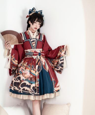 ジャンスカ 5色 JSK 和ロリ 通年 春秋 春夏 プリント フレア ウエストマーク リボン フリル レース フレア ミディアム丈 おしゃれ 和柄 和服 ひざ丈 ノースリーブ ドレス 撮影 イベント かわいい ゴスロリ ロリータファッション loli4388