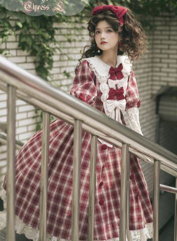 ドレスワンピース Elpress 春夏 通年 春秋 半袖 パフスリーブ チェック ワンピースのみ ミディアム丈 ミモレ丈 ひざ下丈 甘ロリ カジュアル リボン レース フリル 姫ロリ Lolira ロリィタ ゴスロリ ロリータファッション loli5143