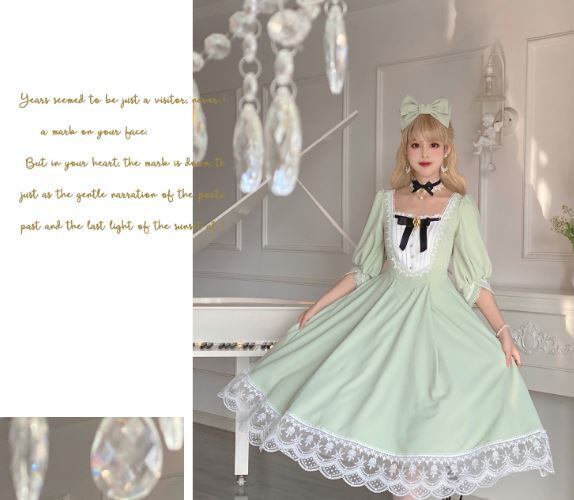 ロリータファッション/ワンピース/春夏/五分袖/リボン/ロング丈/レース/フレア/スクエアネック/甘ロリ/フリル/ふんわり/森ガール/ドール/姫ロリ/エレガント/上品/レトロ/お茶会/撮影/舞台/撮影用/クリスマス/バレンタイン/イベント/結婚式/ウェディング/二次会/謝恩会/デート/お呼ばれ/パーティー/デート