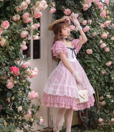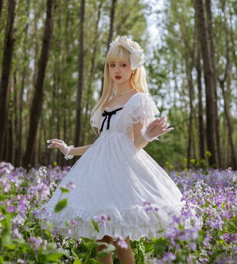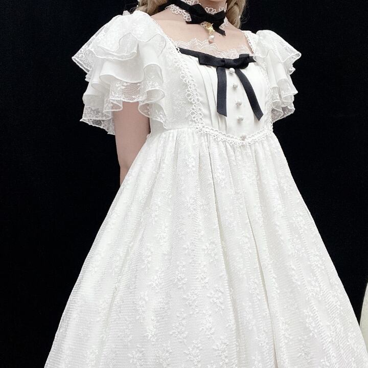 ロリータファッション/甘ロリ/ドレス/ワンピース/ワンピ/ミディアム丈/ワンピのみ/フラワーレース/レース/フレア/半袖/フリル/ふんわり/森ガール/ドール/姫ロリ/エレガント/上品/レトロ/お茶会/撮影/舞台/撮影用/クリスマス/バレンタイン/イベント/結婚式/ウェディング/二次会/謝恩会/デート/お呼ばれ/パーティー/デート